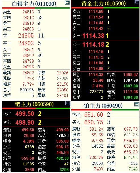 贵金属强势运行, 日内恢复交易后, 国内贵金属四大品种 纷纷大幅拉升,再创近期新高。 截止10:15分, 国内黄金期货主力停收于1114.38元, 较上一日涨26.48元,涨幅2.43%; 白银期货主力合约停收于24802元, 较上一日上涨1793元,涨幅高达7.79%; 铂金主力停收于681.2元,涨幅9.63%; 钯金主力停收于499.5元,涨幅4.3%。 四大贵金属品种, 您追我赶,不断上涨!