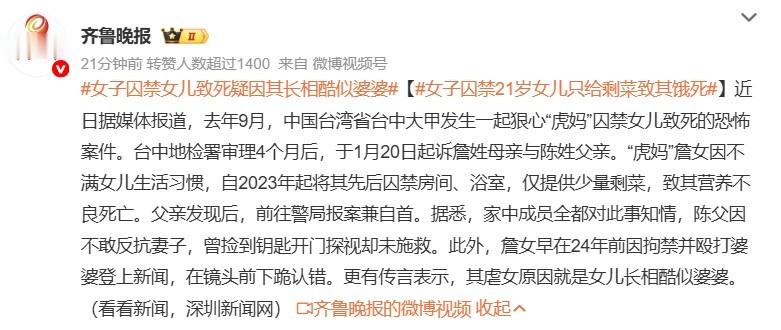 女子囚禁女儿致死疑因其长相酷似婆婆 一定要说明这是台湾省的阴间新闻,活活饿死21岁的亲生女儿简直不敢想象。这个母亲有什么大的能量可以囚禁如此年龄的女儿,难道她的女儿和家人都不敢有任何反抗吗?21岁已经是成年人,凭力量她母亲都不一定能打得过她,没有其他人的帮助是不可能被囚禁的。