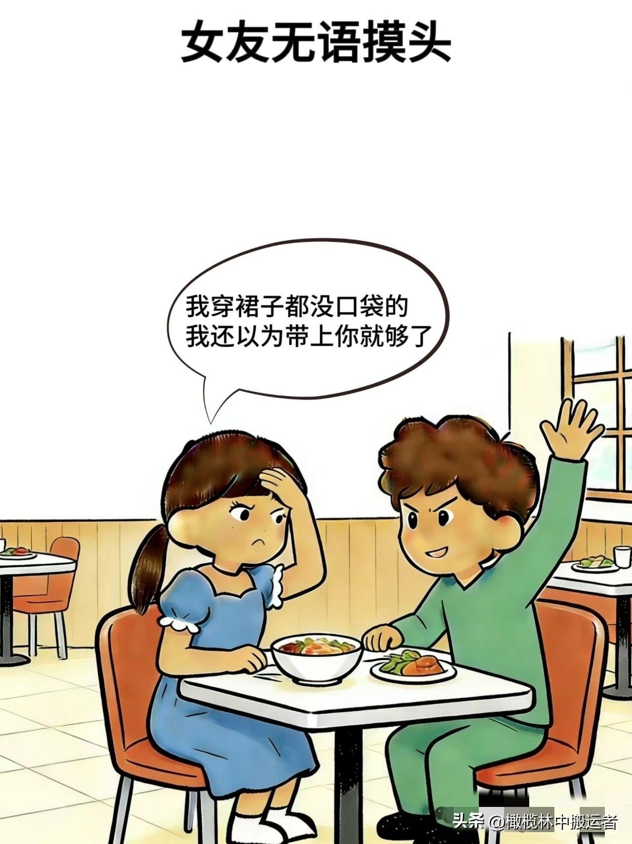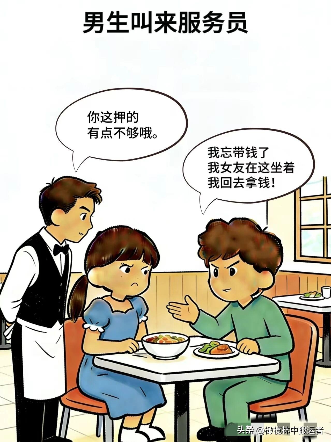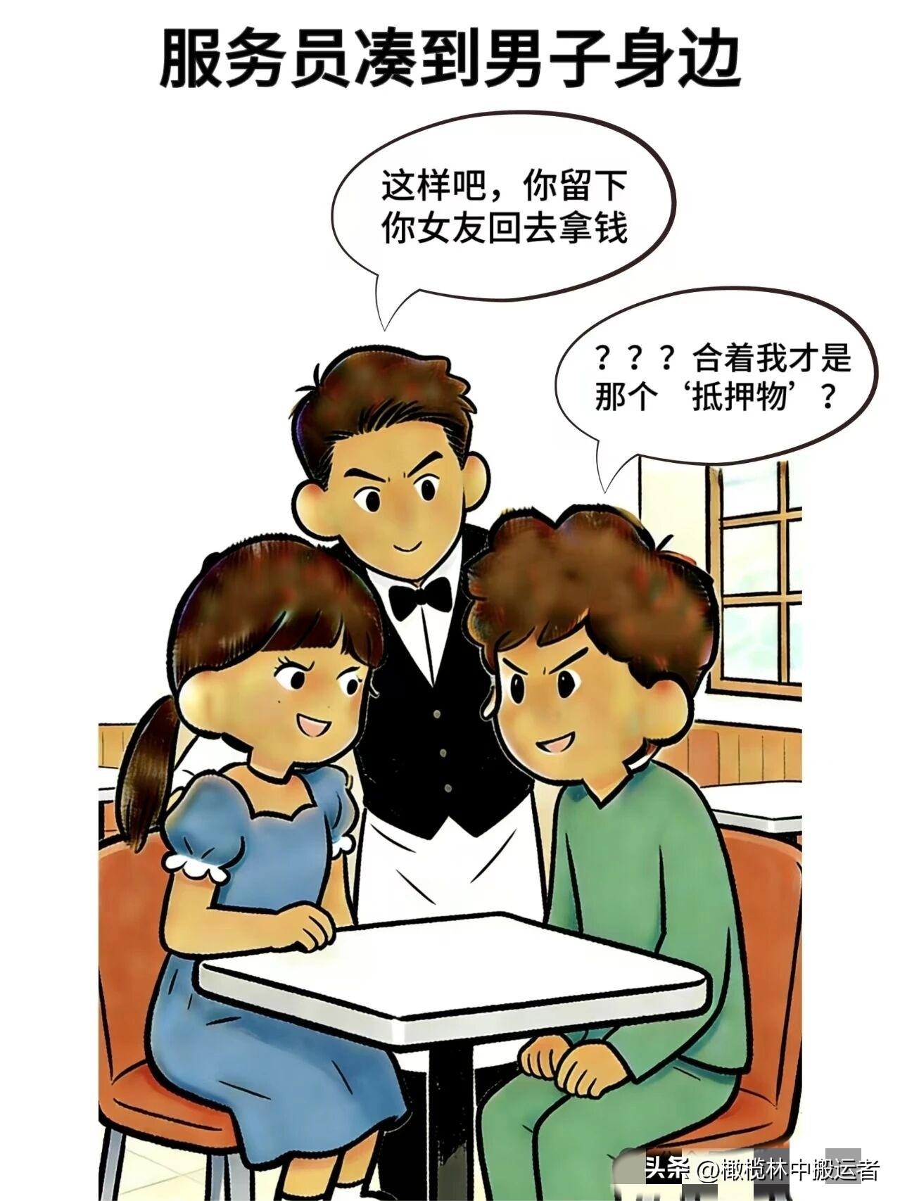 趣味漫画:男生:我忘带钱了,你去买单,女友:我裙子没口袋,我以为带上你就够了,男生:我忘带钱了,我女友押这,服务员:你这押的不够