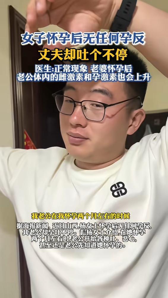 “离了个大谱!”近日,山西,一女子怀孕后,半点孕期反应都没有,而丈夫却吐得昏天暗地,什么都吃不下去,更有意思的是,还是丈夫刚开始频繁恶心,才察觉异常,让女子验孕,她才发现自己有了宝宝。网友:看得出来这是真爱! 近日山西,一对年轻夫妻过着平淡又幸福的小日子,两人结婚没多久,一直盼着能有一个属于自己的宝宝,平日里也十分注意作息和饮食,可不管怎么期待,始终没有动静,久而久之,两人也渐渐放下了执念,想着顺其自然就好。 变故发生在半个多月前,原本身体一直很硬朗、胃口极好的丈夫,突然变得不对劲起来。一开始只是早上起床后,会莫名感到恶心,反酸水,以为是前一天晚上没休息好,或者吃坏了东西,他也没太在意,只想着多喝热水、多休息,就能慢慢缓解。 可谁能想到,这种恶心的感觉不仅没有缓解,反而越来越严重,渐渐发展到一天吐好几次的地步。不管是吃饭的时候,还是工作间隙,只要闻到一点油腻味、饭菜味, 甚至是平时常闻的洗衣液味道,他都会忍不住干呕,严重的时候,吃进去的东西还没消化,就全部吐了出来,整个人瘦了一圈,浑身没力气,连上班都受到了影响。 丈夫连着难受了好几天,吃不下饭、睡不好觉,整个人萎靡不振,妻子看在眼里、急在心里,陪着他去附近的诊所检查, 可查来查去,各项指标都很正常,医生也没查出什么问题,只说可能是肠胃不适,开了点助消化、止吐的药,让他注意饮食清淡、多休息。 遵医嘱吃了药、调整了饮食,丈夫的症状依旧没有好转,反而越来越严重,有时候吐得浑身发软,连站起来的力气都没有。 看着丈夫难受的模样,妻子既心疼又着急,反复琢磨着到底是哪里出了问题,可想来想去,也没找到关键原因。 有一天,丈夫又吐得昏天暗地,缓过劲来后,他突然脑子里灵光一闪,联想到最近两人一直盼着怀孕,再看看自己这反常的反应,一个大胆的念头冒了出来——会不会不是自己身体出了问题,而是妻子怀孕了? 这个念头一出,丈夫自己都觉得有点离谱,可越想越觉得有可能。他强撑着身体,跟妻子说起了自己的猜测,催着妻子去买验孕棒验孕,看看是不是真的怀上了。妻子一开始还觉得好笑,觉得丈夫是吐糊涂了,自己一点感觉都没有,怎么可能怀孕。 耐不住丈夫的反复催促,也想着图个安心,妻子终究还是答应了,特意抽时间去买了验孕棒,回家后按照说明操作,等待结果的几分钟里,两人都十分紧张,丈夫甚至还在一旁忍不住干呕了几声。 当看到验孕棒上出现两条清晰的红线时,两人都愣住了,妻子更是不敢相信自己的眼睛,反复看了好几遍,才确认自己真的怀孕了。 那一刻,所有的疑惑都有了答案,丈夫这几天反常的恶心、呕吐,竟然都是因为妻子怀了宝宝,那种看似离谱的反应,其实是一种特殊的孕期伴随症状。 后来两人又去医院做了详细检查,医生确认妻子已经怀孕六周左右,身体状况一切良好,之所以没有出现任何孕期反应,是因为每个人的体质不同,部分孕妇本身就不会有明显的孕反,这属于正常现象。而丈夫出现的恶心、呕吐等症状,医生称之为“拟娩综合征”,也叫妊娠伴随综合症。 医生解释,这种症状在准爸爸身上并不少见,大多是因为妻子怀孕后,准爸爸体内的激素水平发生了微妙变化,加上心理上的紧张、焦虑和对妻子的心疼, 进而引发了类似孕期反应的身体表现,而且越是和妻子感情亲密、责任心强的准爸爸,这种症状可能就越明显,通常不需要特殊治疗,调整心态、放松心情后,就能慢慢缓解。 得知真相后,夫妻两人又好笑又感动,妻子看着依旧时不时会干呕的丈夫,心里满是暖意,原本平淡的小日子,因为这个意外到来的宝宝,多了几分趣味和期待。 丈夫虽然依旧难受,但一想到自己快要当爸爸了,脸上就忍不住露出笑容,哪怕吐得昏天暗地,也觉得一切都值得。 这件事被夫妻两人的朋友偶然得知,拍下了丈夫干呕的片段,发布到网上后,迅速引发了不少人的关注和调侃。 有人留言说,这才是真正的感同身受,连孕反都替妻子扛了,看得出来是真爱;也有人说,太神奇了,第一次见准爸爸比孕妇还遭罪,真是又离谱又暖心。 对此,你们有什么看法,欢迎评论留言~