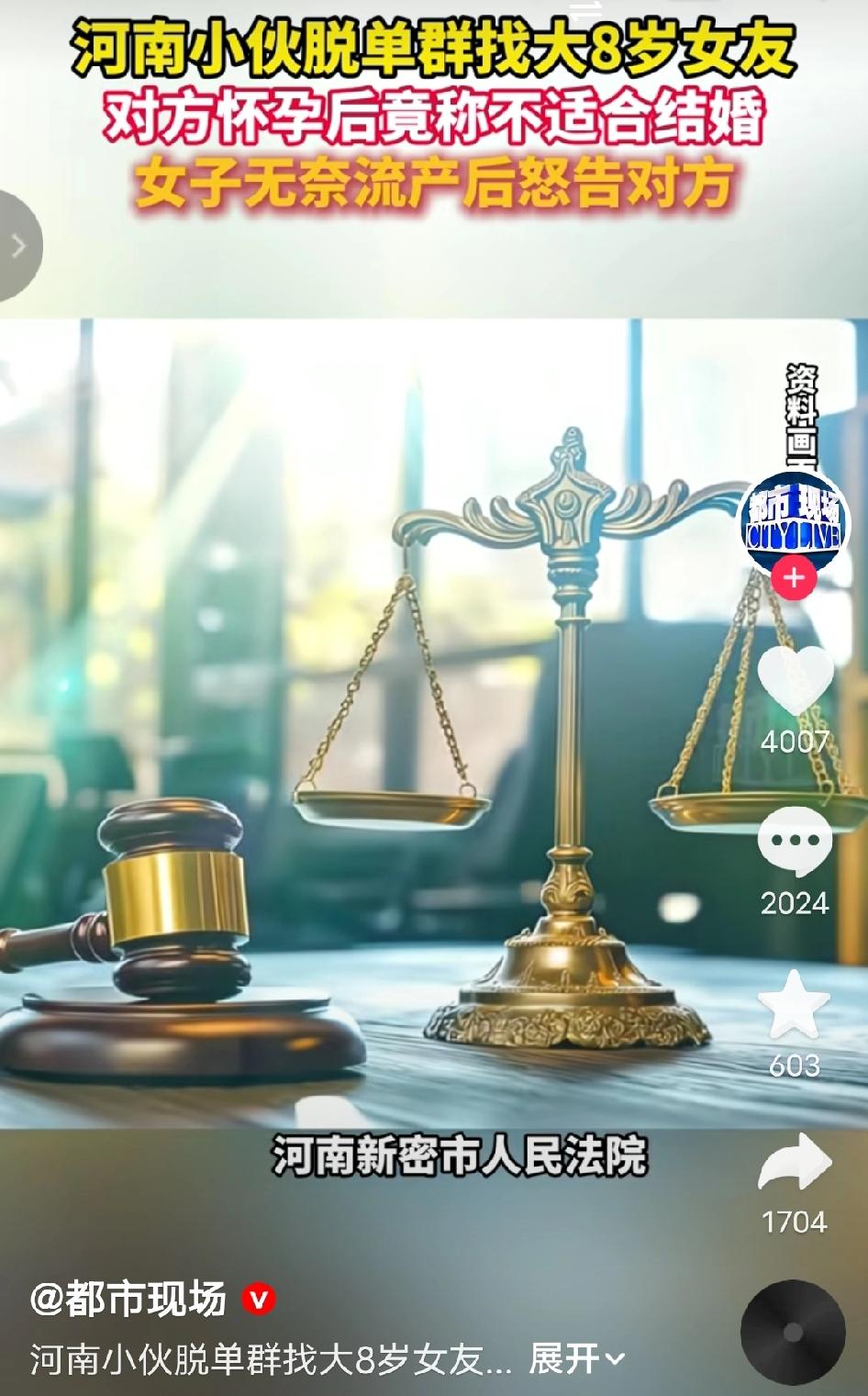 太气人了!22岁河南小伙在脱单群认识大8岁女友,承诺结婚后发生关系,等对方怀孕却翻脸不认人:“我年纪太小,不适合结婚!”女子无奈流产后怒告上法庭,法院最终判决男方补偿8700元! 2025年4月,22岁的河南小伙小刘加入了郑州本地一个微信“脱单群”,群里一句“想找个踏实的姐姐结婚过日子”的发言,吸引了30岁的小杨。两人线下见面后,小刘反复表示“就喜欢成熟稳重的女生,想尽快定下来结婚”,被这份“诚意”打动的小杨很快和他确立了恋爱关系,不到一个月便同居了。 同年7月,小杨用验孕棒测出两条红杠,她拿着试纸冲进客厅,兴冲冲地对着正打游戏的小刘说:“我们有宝宝了!”小刘当时愣了一下,随即笑着抱住她:“太好了,我们马上领证!”可仅仅过了三天,他就态度大变,开始躲躲闪闪,最终摊牌:“我才22岁,还没玩够,不适合结婚生子,这个孩子不能要。” 无论小杨怎么哭着沟通,小刘都铁了心拒绝承担责任,不仅搬回了自己家,还拉黑了她的联系方式。小杨只能独自去医院做了检查,医生告知她“胚胎发育正常,但如果终止妊娠,可能会影响以后受孕”。在反复确认小刘的态度后,她在2025年9月选择了流产手术,前后花费医疗费3600余元,术后因身体虚弱请假休养了半个月,被扣发了工资。 身心俱疲的小杨,最终将小刘起诉至新密市人民法院,要求赔偿医疗费、误工费、精神损害抚慰金等共计4.5万元。法庭上,小刘辩称双方是自愿发生关系,怀孕是意外,自己没有过错,甚至反咬一口说“是她主动要和我在一起的”。 法院审理后认为,两人自愿发生性关系导致怀孕,均无侵害对方健康的故意,但小刘未采取安全措施存在一定过错,且在承诺结婚后反悔,给小杨造成了额外的精神压力。最终判决小刘补偿小杨各项损失的50%,共计8700余元。 网友评论 - “一句‘年纪太小’就毁了别人的身体和感情,8700块根本不够弥补!” - “脱单群里的承诺果然不能信,姑娘太傻了,遇到这种渣男真是倒了霉。” - “法律只能补偿实际损失,但精神上的伤害多少钱都换不回来。” - “这判决也给所有女孩提了醒:婚前一定要擦亮眼睛,保护好自己。” 一句轻飘飘的“不适合结婚”,背后是一个女人的身心俱疲。 你觉得8700元的补偿,能弥补这个姑娘受到的伤害吗? 河南小伙脱单群悔婚拒担责 女子流产怒告获赔 争议民生 新密法院判决 来源:都市现场及网络公开内容,如有侵权请联系即删 配图说明:本文配图/视频素材来自抖音@都市现场,仅用于内容分享,侵权联删