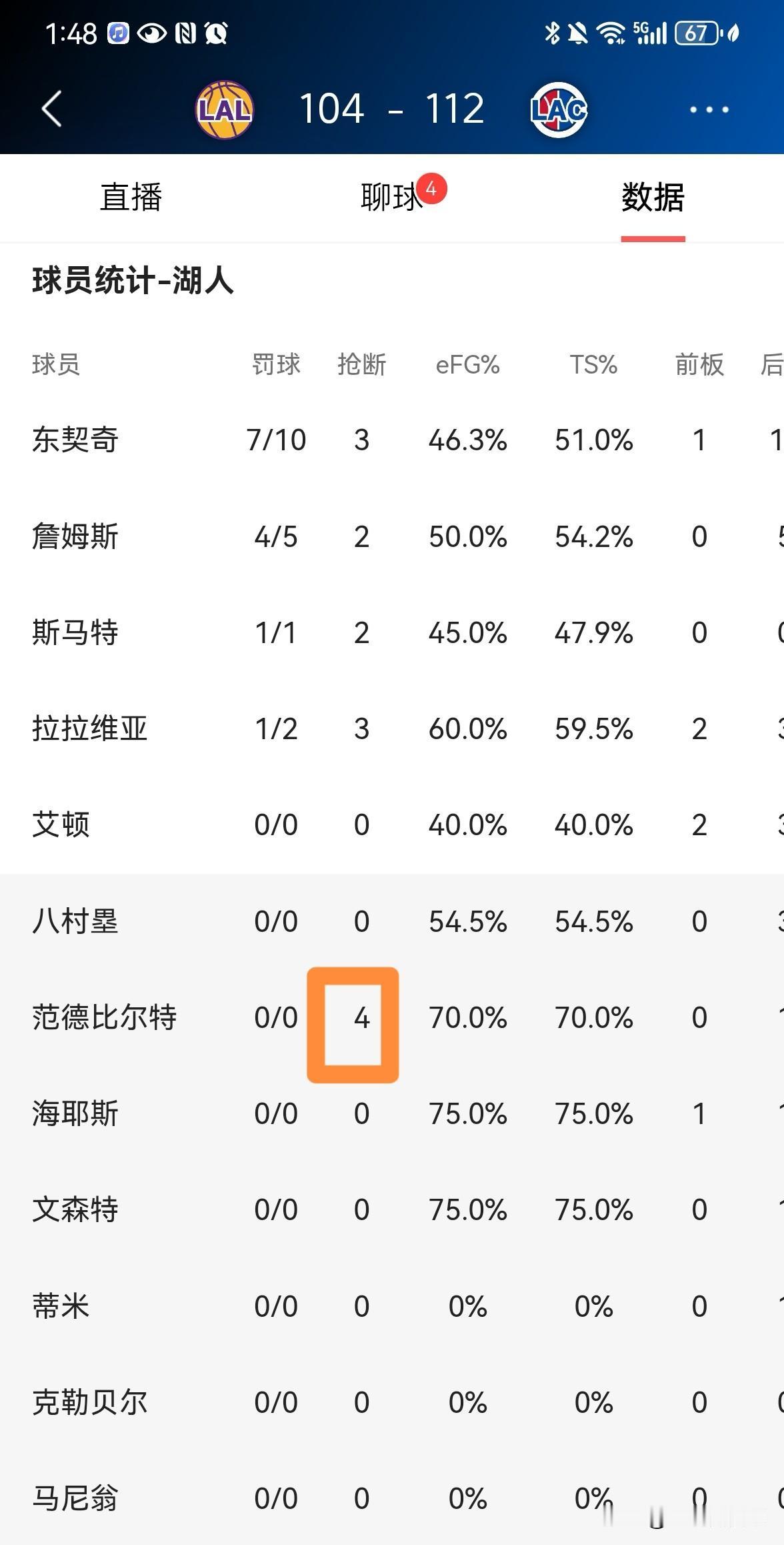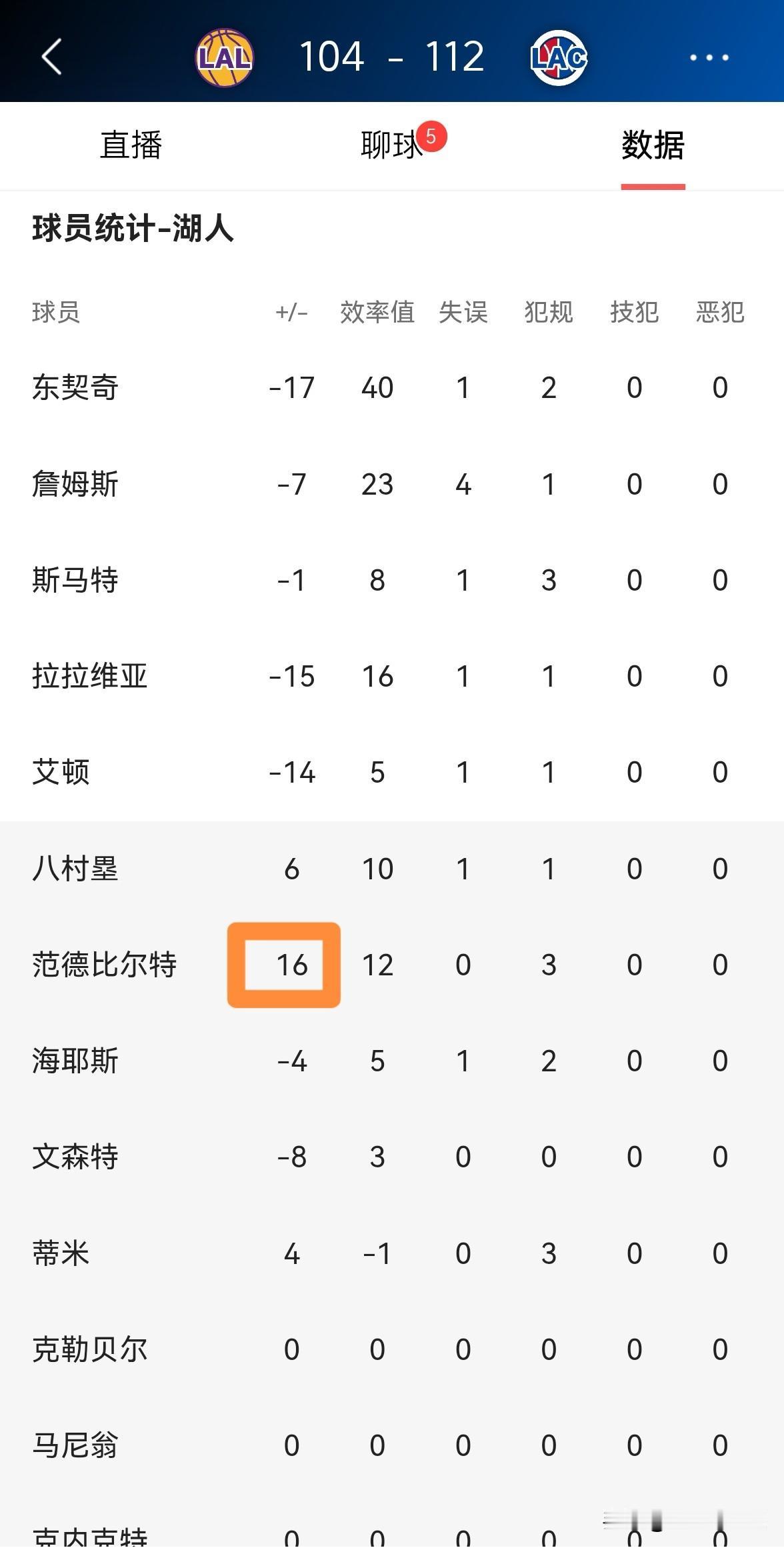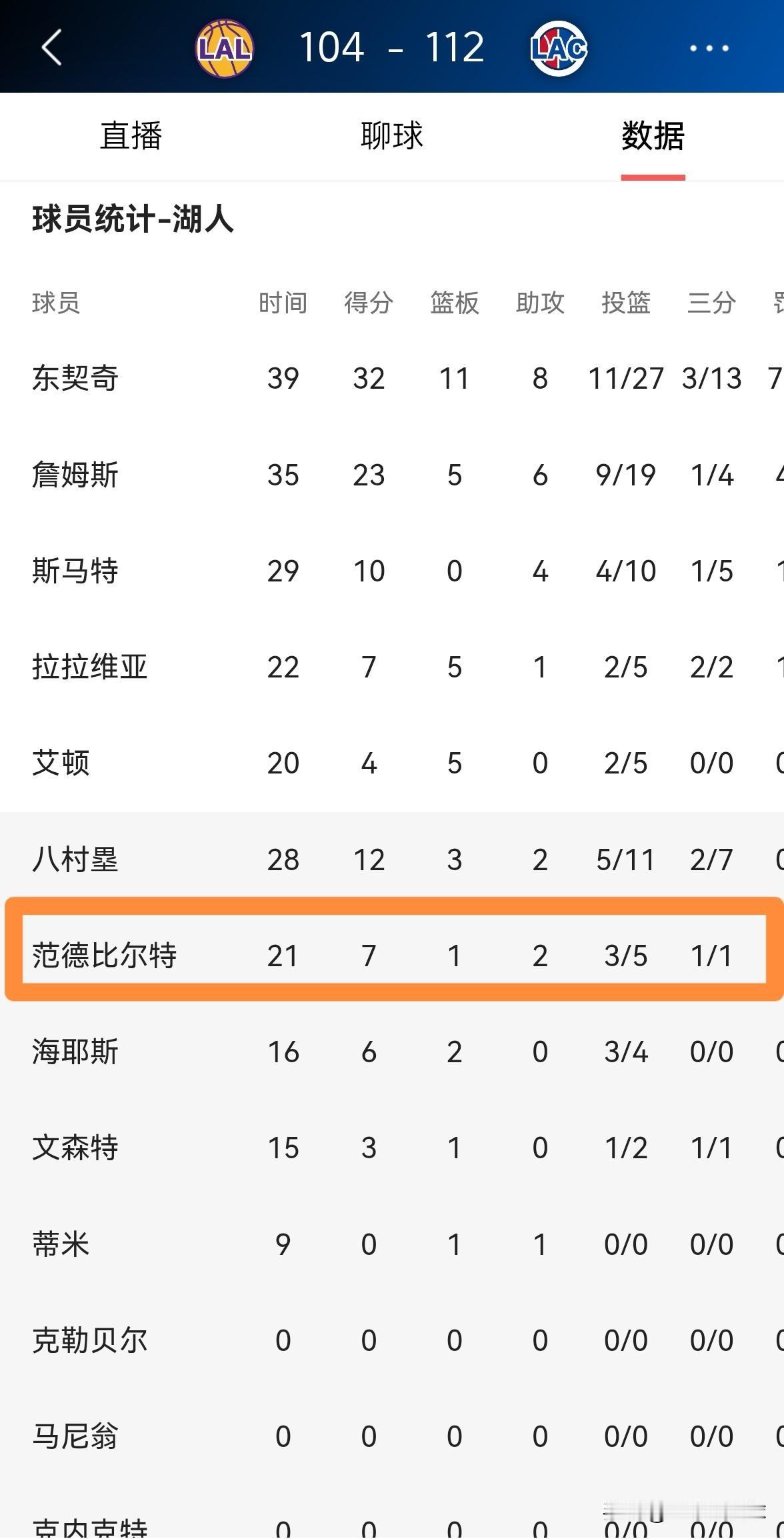 我要把最热烈的掌声送给湖人大将范德比尔特!虽然今天湖人在客场以104:112不敌快船,但是范德比尔特在攻防两端都打出了非常亮眼的表现。毫不夸张的说,如果没有范德比尔特,湖人必然会惨败于快船。 全场比赛下来,范德比尔特替补出战21分钟,投篮5中3,其中三分球1中1得到7分1篮板2助攻4抢断1盖帽,他的场上正负值为全队最高的+16。 值得一提的是,本场比赛范德比尔特对伦纳德的防守相当强硬,导致伦纳德多次情绪失控。