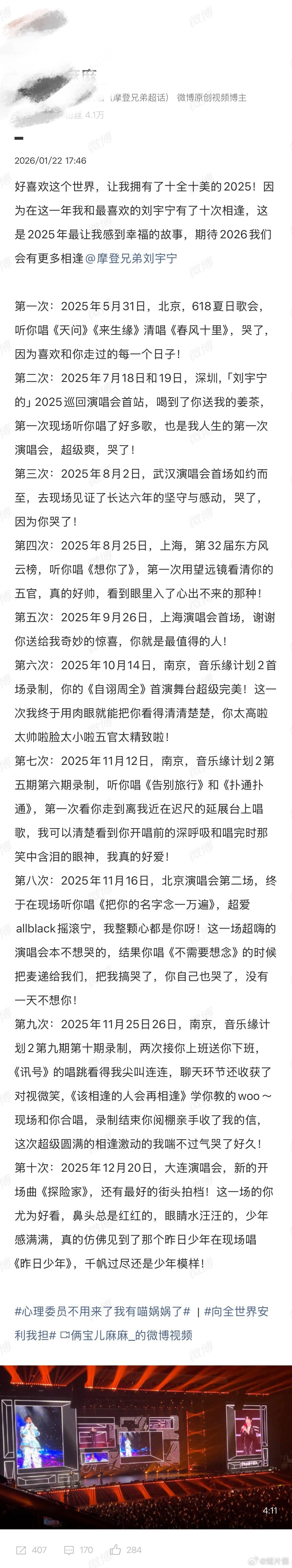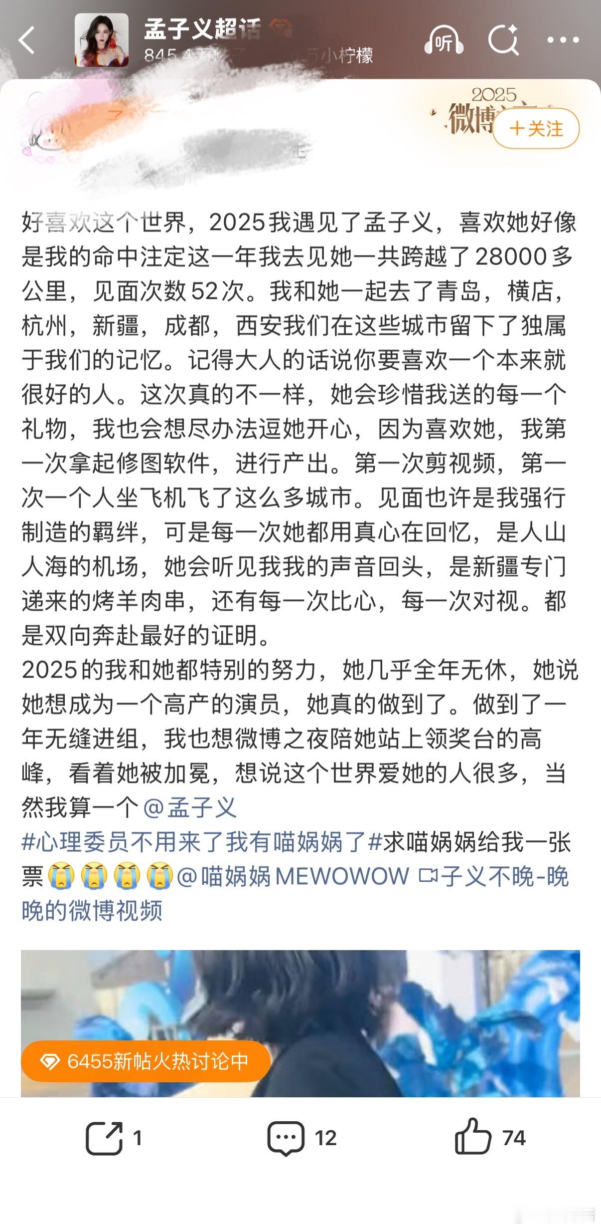 追星女最懂老派浪漫了 昨天喵娲娲送微博之夜门票,规则是用“好喜欢这个世界”开头写故事。结果页面被追星女孩的长文刷屏:有老师写和学生互相治愈,有研一新生写迷茫,还有飞三万公里去见自担的。原来追星人的浪漫是把乌托邦写进现实,用一句“好喜欢”对抗所有不如意。