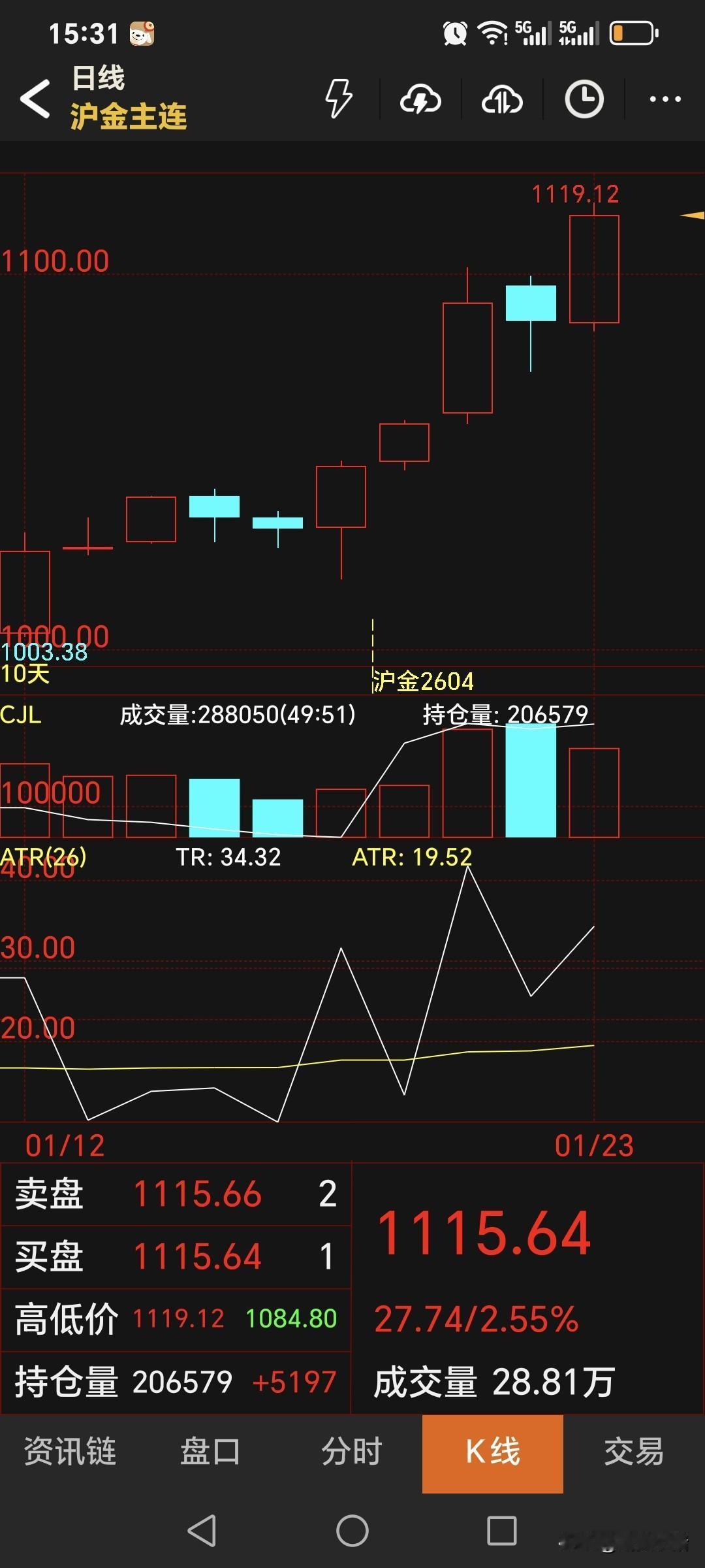 星期五, 国内黄金期货继续飙升, 主力合约收盘于1115.64元, 比周四的收盘高了28.06元; 结算价1102.86元, 比昨日高了14.96元。 当日低开高走, 开盘价远低于收盘价, 因此从盘面看, 收于一根上涨的阳线!