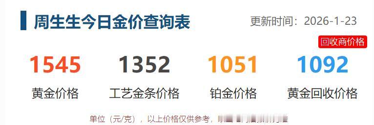 今天国内黄金饰品 大幅提高销售价格。 比如周生生 今日(23日)黄金价格为1545元, 比昨日提高了53元; 工艺金条价格为1352元; 铂金价格为1051元; 黄金的回收价格为1092元。 您还敢买入黄金饰品?