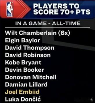 NBA历史记录,单场得分超过70+的球员都有谁? 第一名:张伯伦曾经7次得分成过70+; 第二名:贝勒; 第三名:大卫·汤普森; 第四名:大卫·罗宾逊; 第五名:科比·布莱恩特; 第六名:德文·布克; 第七名:多诺万·米切尔; 第八名:达米安·利拉德; 第九名:大帝·恩比德; 第十名:卢卡·东契奇。 以上10位球员是NBA成立以来取得该成绩的优秀球员,从第五名到第十名均看过影像资料,忆往昔,青春年华都在NBA比赛中度过。