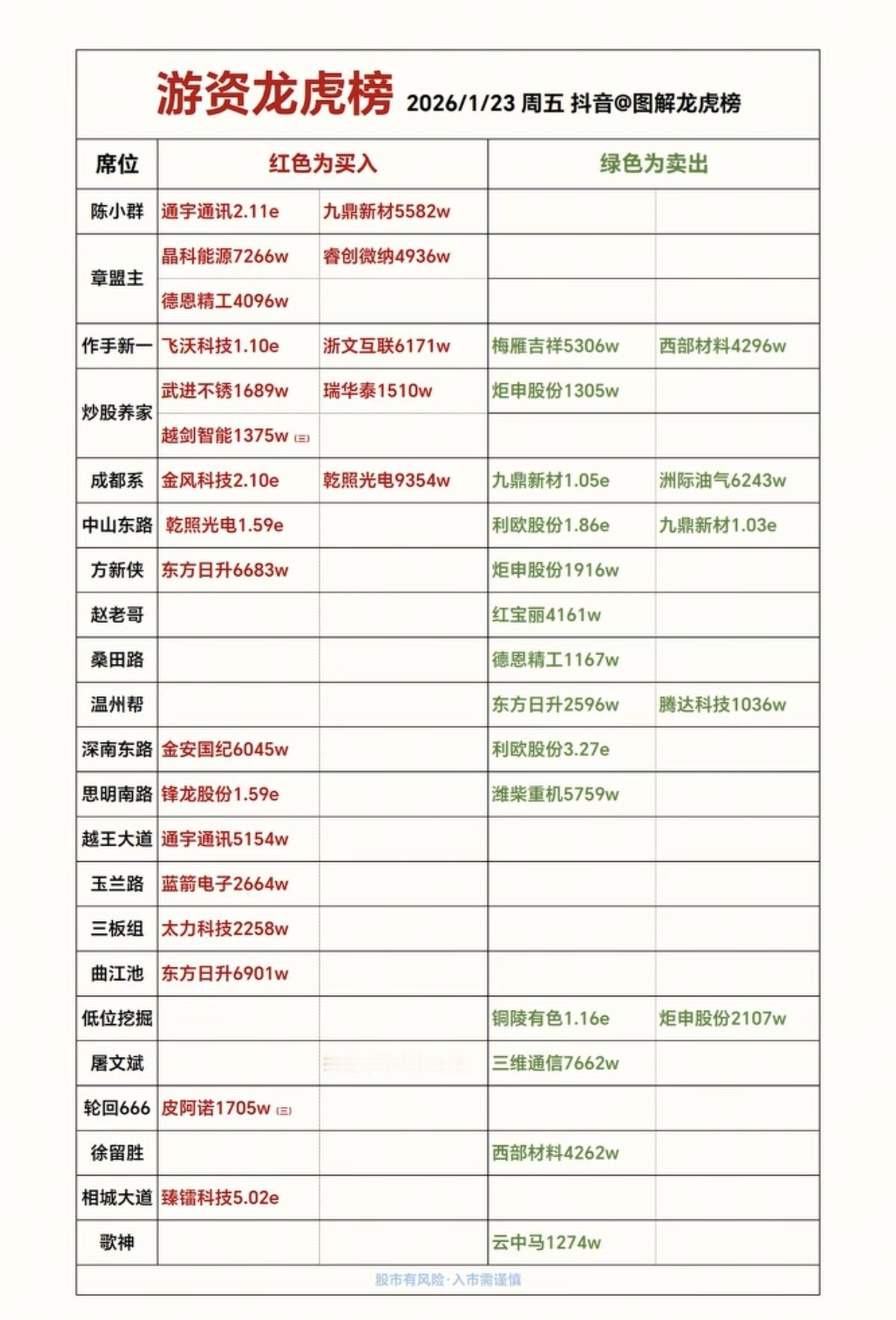 1.23周五 游资抢筹 龙虎榜! 最新风声较紧,很多游资都不怎么动作了!群总终于出手了。 陈小群 通宇通讯 九鼎新材 通宇通讯,浙文互联获多家游资共同抢筹。