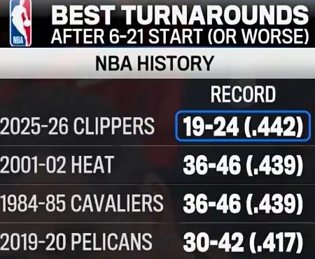神奇的快船,赛季初6胜21负,赛季中20胜24负。 如果选一支本赛季目前为止最神奇的球队,估计很多人都会选择洛杉矶快船。开赛前,他们引进了比尔、保罗,野心勃勃的快船渴望在今年大干一番。 可是事与愿违,快船赛季初表现的非常糟糕,前27场比赛只拿到6场胜利。胜率22.2%的快船也长期处于积分榜末尾。 当时嘴硬的泰伦卢喊出了未来55场,将至少拿到35场胜利的口号时,很多人认为他不切实际,痴人说梦。 但事实证明, 他的球队做到了,快船强势反弹,近17场比赛取得了14胜3负的骄人战绩,胜率高达82.3%。现在的快船依然状态良好,今天的洛城德比,他们战胜湖人。本场比赛获胜后,快船20胜24负,来到西部第10位,胜率由之前22.2提升到45.4。 快船未来还有38场比赛,只要他们再胜17场,球队将创造NBA最佳扭转局面赛季。