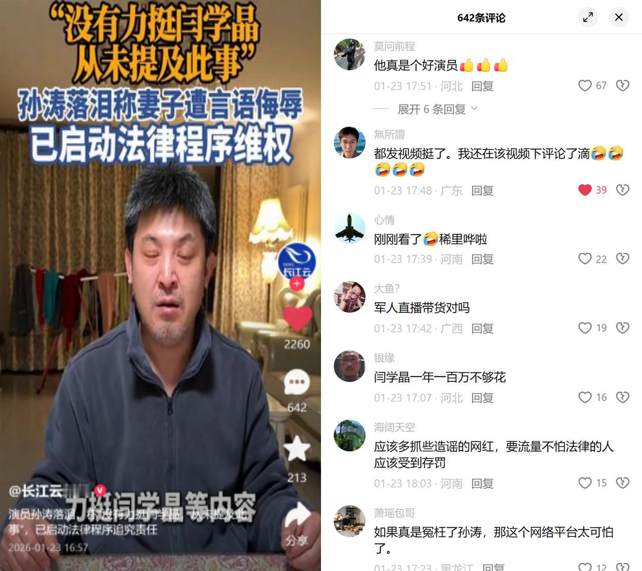 春晚演了20多年小品的孙涛,昨天直播对着镜头哭了。 这一次没演小品里的苦情戏,那是真委屈,有人说他直播力挺闫学晶,拍案而起骂大家,可他翻出1月2号的完整录屏,全程没提过闫学晶一个字。更糟的是,老婆因为这事儿被骂,他红着眼眶说要打官司。 这事儿最让人寒的,倒不全是造谣的营销号,留言区里的曼德拉效应才更吓人,好几个人说我在那视频下留过言,可那视频压根不存在。就像有人编了个老友仗义的剧本,一群人跟着回忆起自己没见过的画面。孙涛四年没上春晚,也没直播带货,就因为和闫学晶合作过,就能被硬按上站台的帽子。你拿出证据,有人说你在公关;你说没带货,有人问军人直播对吗,真相在谣言面前,倒成了多余的辩解。 孙涛说要告造谣的,可网络里的真实有时候很脆弱:编出来的故事有情绪、有冲突,比干巴巴的录屏更好传。等他赢了官司,那些看过视频的人,会不会突然反应过来,自己记的,原来是别人编的假记忆? 毕竟,当虚构的证据被集体坚信,谁都可能成为下一个被造谣的人。