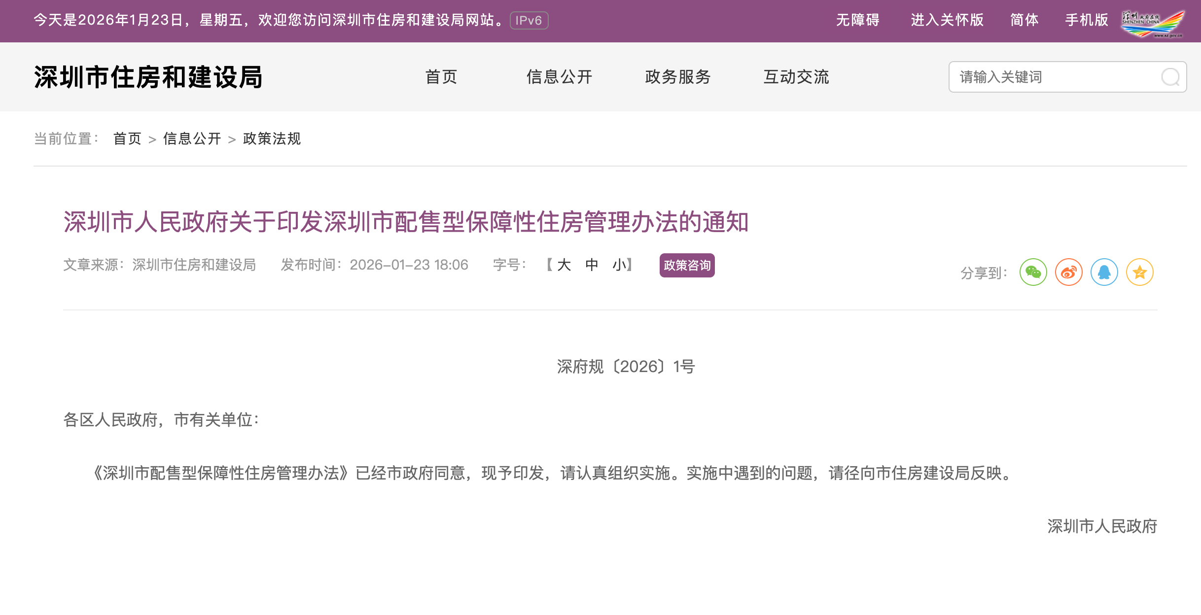 《办法》共5章37条,明确了配售型保障性住房的申请条件、配售方式及流程、封闭管理、使用监管等内容。将于2026年3月1日起施行。