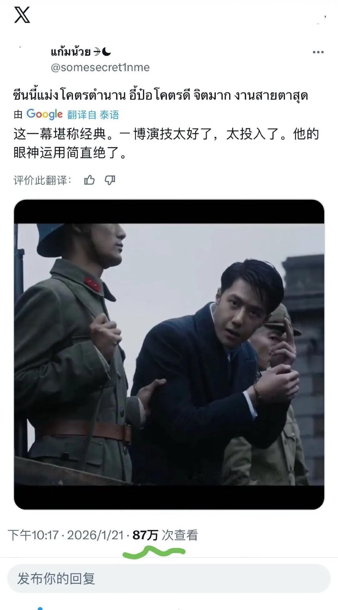 王一博《无名》在X(推特)上又火了🔥!纯自来水非上映期,播放量近百万!另一个帖子播放量也有70万播放量。评论区是路人被名场面叶先生卡车笑吸引想看电影。 推特的算法奇葩,分区分国家比别的平台限很多。在日娱韩娱大本营的推特上,王一博这个播放量太厉害了! 看来不同国家的人们审美还是一致的。很多人都被王一博这个名场面卡车笑的演技惊到起鸡皮疙瘩。(学到了鸡皮疙瘩的英文:goosebumps)