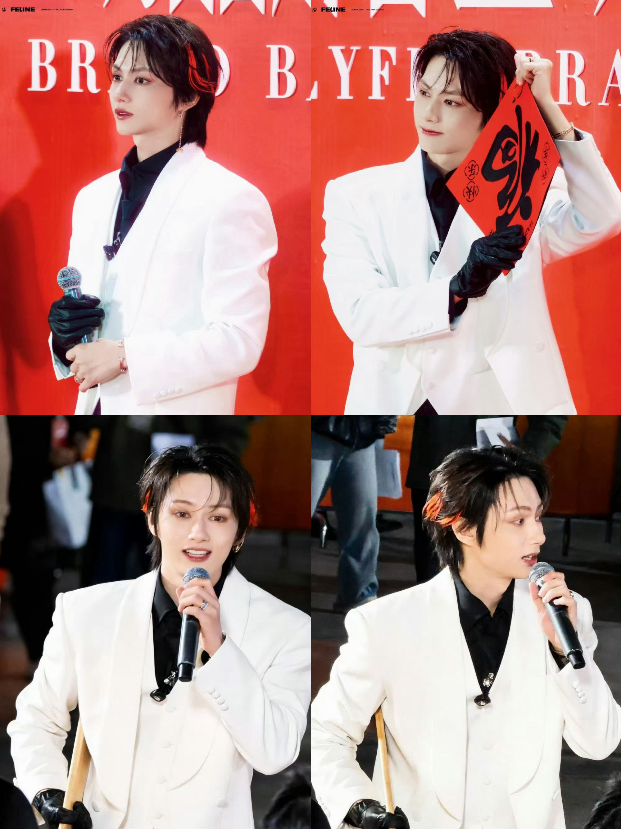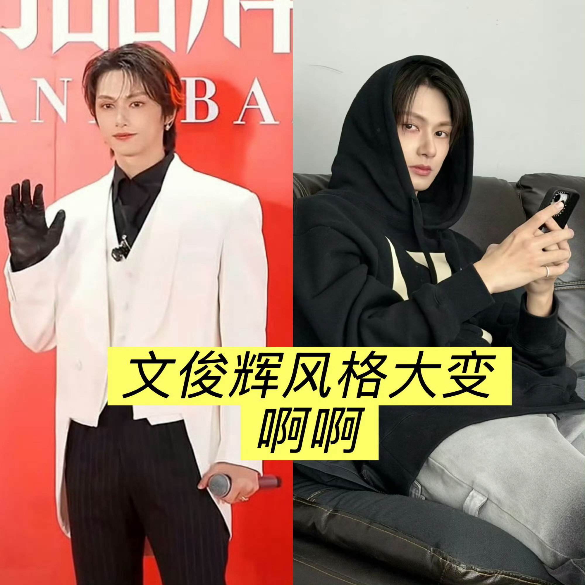文俊辉风格大变 谁能拒绝文俊辉这样的风格大变啊!白色燕尾服+黑色手套+红发挑染,三重buff叠加,贵气与桀骜并存,优雅与野性共生,和他以往的形象形成强烈反差