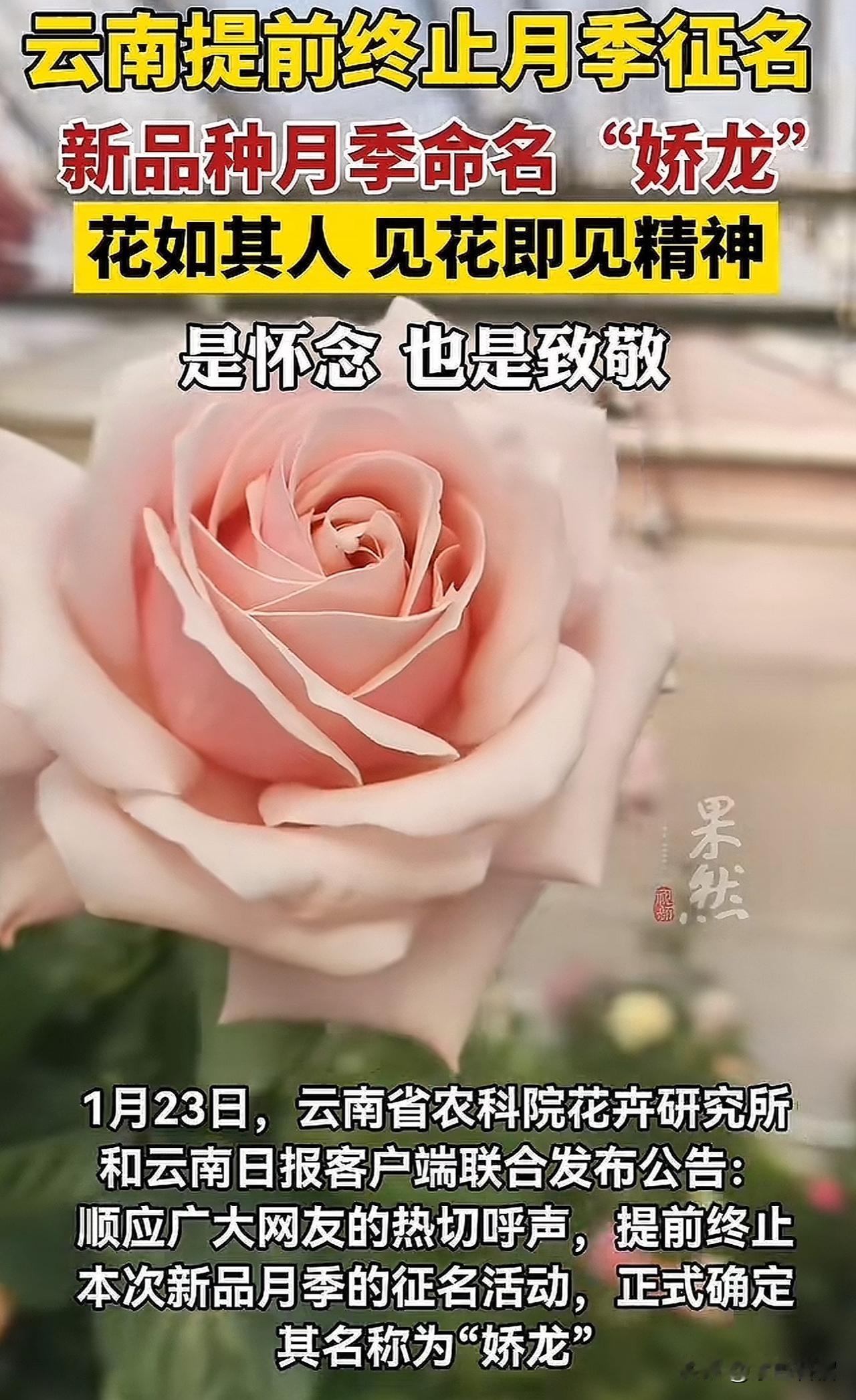 确定了,就叫“娇龙”。 云南“4815 - 27”号玫瑰确定拟命名为“娇龙”,以此纪念近日离世的新疆维吾尔自治区农产品建设服务中心主任贺娇龙。 这朵月季也仿佛专为贺娇龙主任而生,编号4815–27首尾数字4和7,恰好对应她47岁的终年;末尾两位数字27,正是她27年的工龄。那粉红的颜色,恰是贺主任生前钟爱的颜色之一,她曾多次在公开场合身着粉红色衣服亮相。 希望这株“娇龙”月季能带着娇龙精神与人民的爱,在祖国的每一寸土地上热烈绽放。 (图片来源网络)