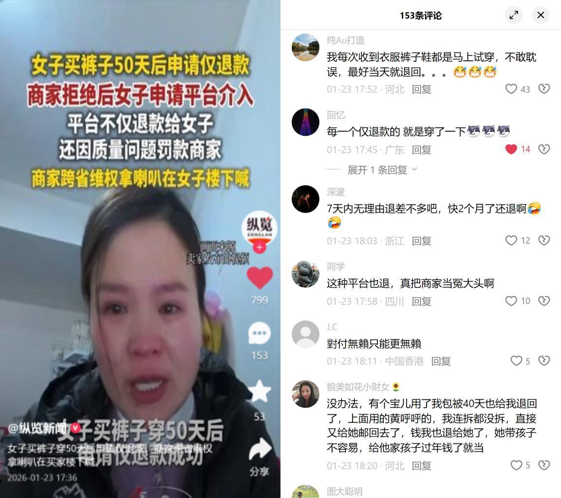 浙江湖州商家跨省到买家楼下,举着喇叭喊“高家十分抱歉”,不为别的,就为条穿了俩月的裤子。 女子买裤子穿了50天,突然说质量有问题要仅退款。商家拒绝后,平台直接介入给退了款,还因为质量问题罚了商家一笔。商家气不过,从外地赶过来,举着喇叭要说法,最后总算追回了损失。 这事儿看着是买家无理,根源在于早年平台的规则漏洞,为了抢用户,平台把保护消费者做成了偏袒:只要买家敲几个质量差的关键词,不用传证据不用验货物,系统自动触发退款,哪怕穿俩月也能仅退款。商家想举证?要么拿不出权威报告,要么等检测完钱早没了,只能当冤大头。就像大家说的,“现在真正弱势的明明是商家”,你卖正常东西,被骂黑心;你拒绝无理要求,平台说你不懂服务,最后只能用最笨的办法要说法。 好在现在规则改了。拼多多淘宝这些平台早取消了强制介入,商家终于能跟买家好好商量:穿50天要退款?行,先拿出质量问题的证据来。想退可以,但得讲点道理。 归根结底,最该守的从来都是边界,买家别把权益当占便宜,平台别把流量凌驾于公平之上。不然到最后,谁还愿意好好做生意?谁还敢放心买东西?