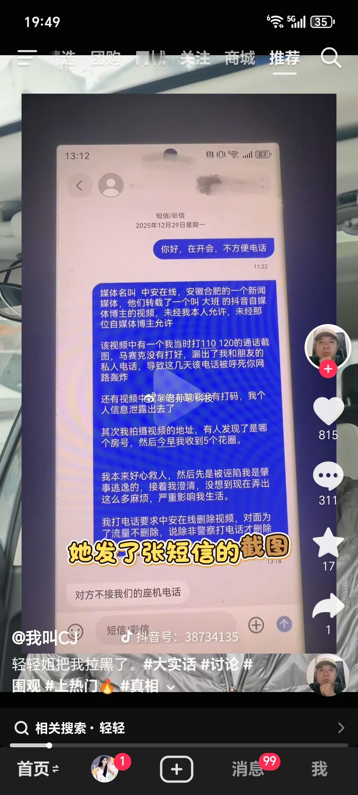 这姐姐是疯了吗?咱做截图的时候能不能用点心姐姐回应某博主,晒出当是车主给她的短信截图,希望证明她没有撒谎,都是车主自己说可问题是,这张截图是你发出去的信息截图,左下角才是对方发过来的自己冒充车主发了一条信息,然后假装证据,好歹用备用机给自己发,已经急到跳墙地步了吗
