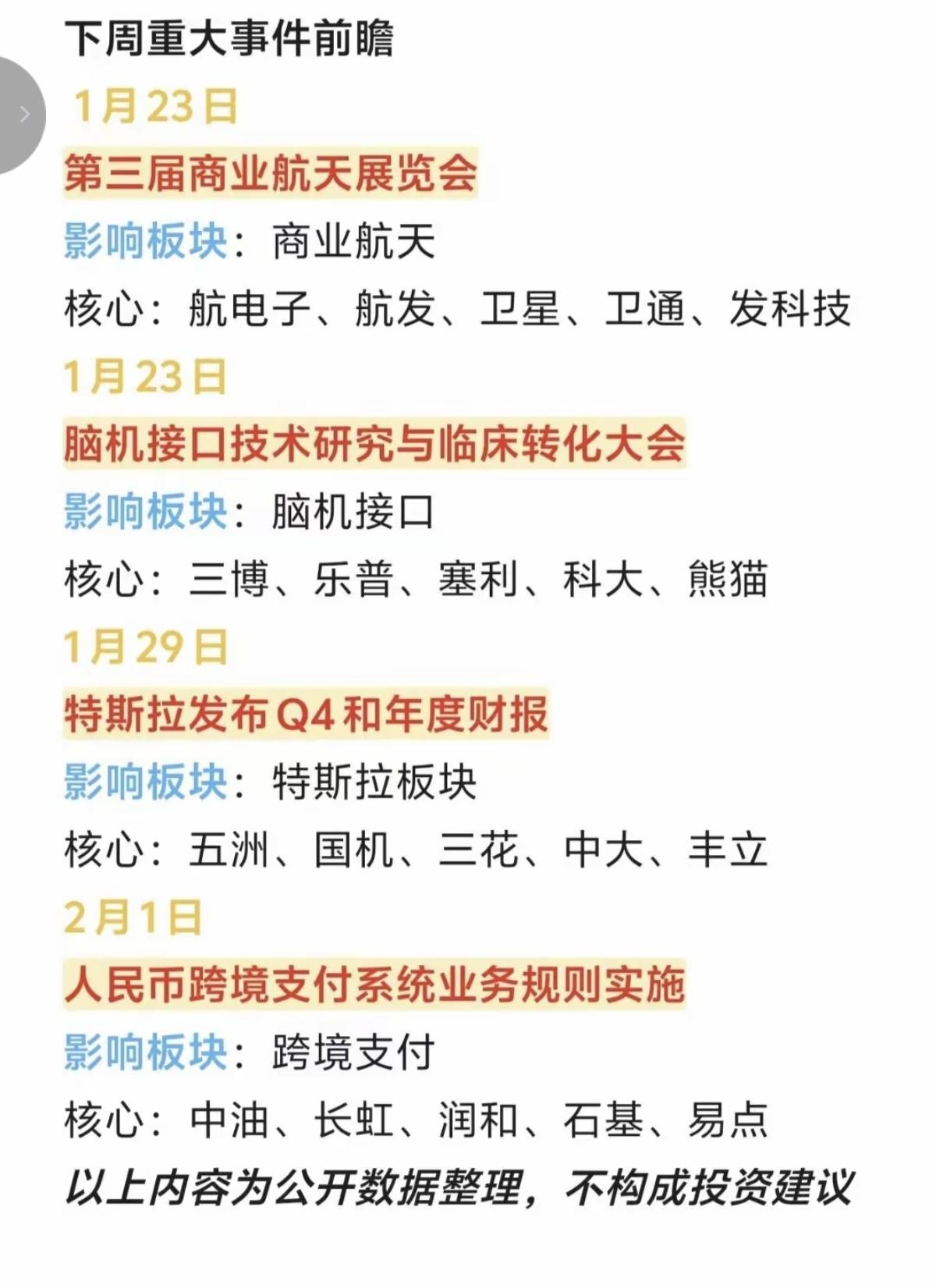 下周财经大事件前瞻! (1.26~1.31) 1.商业航天,太空算力 2.脑机接口 3.特斯拉财报 4.跨境支付,AI金融