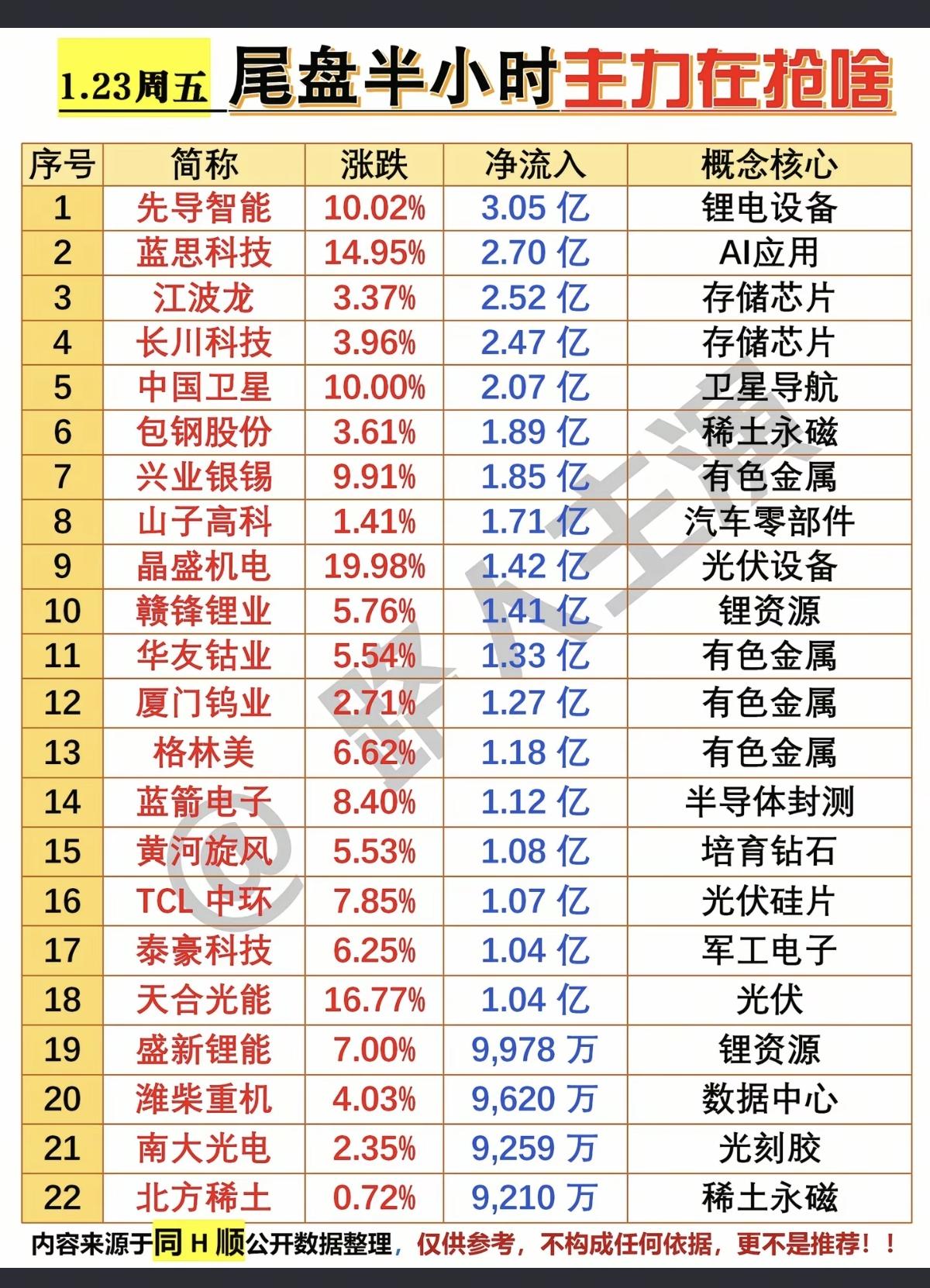 1.23周五 尾盘半小时 主力在抢啥股?! 1.存储芯片 2.光伏设备 3.有色金属 4.锂矿资源 5.军工电子