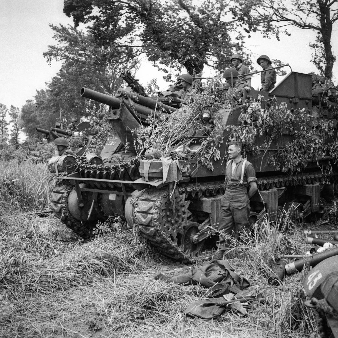 1944年法国诺曼底登陆战历史留影!二战欧洲战场各国作战部队军事装备是真的先进啊!即便到了今天也可以碾压大部分国家! 图一:1944年6月,美军正在奥马哈海滩登陆,各式军车纷纷派上用场。 图二:1944年7月14日,诺曼底地区,美军正在集中押送刚搜捕来的德军战俘。 图三:1944年6月6日,热尔曼维尔-叙梅尔附近,隶属于英国第3师皇家炮兵野战团的一个M7“牧师”式自行火炮连正在灌木丛中警戒。 图四:1944年,诺曼底地区,德军伞兵正在前线作战。貌似是宪兵,有懂行的朋友普及哈相关知识不?他们的领章,还有脖子上挂着的铁玩意是干啥的? 图五:1944年6月,盟军诺曼底登陆期间,一名德军豹式坦克歼击车乘员正站在战车车体顶部。 图六:1944年6月10日,维耶维尔-苏尔-梅尔地区,美军非裔士兵小队正沿着农舍行进,预备清除前方的一名德军狙击手。