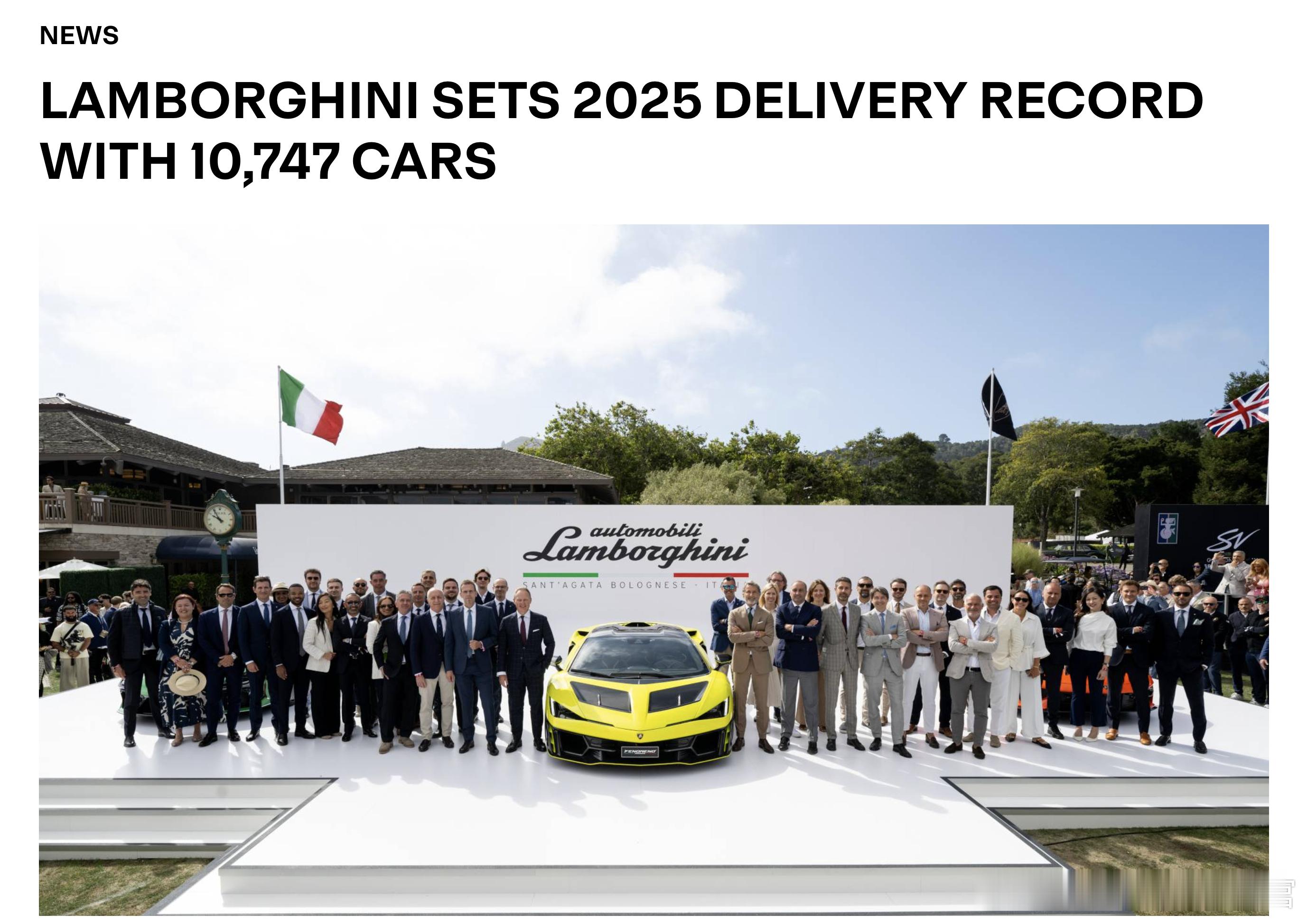 兰博基尼2025销量创历史新高 兰博基尼宣布,2025年全球交付量达到10747辆,创下品牌成立以来的历史新高,近十年销量更是翻了3倍大家身边的超跑变多了吗?