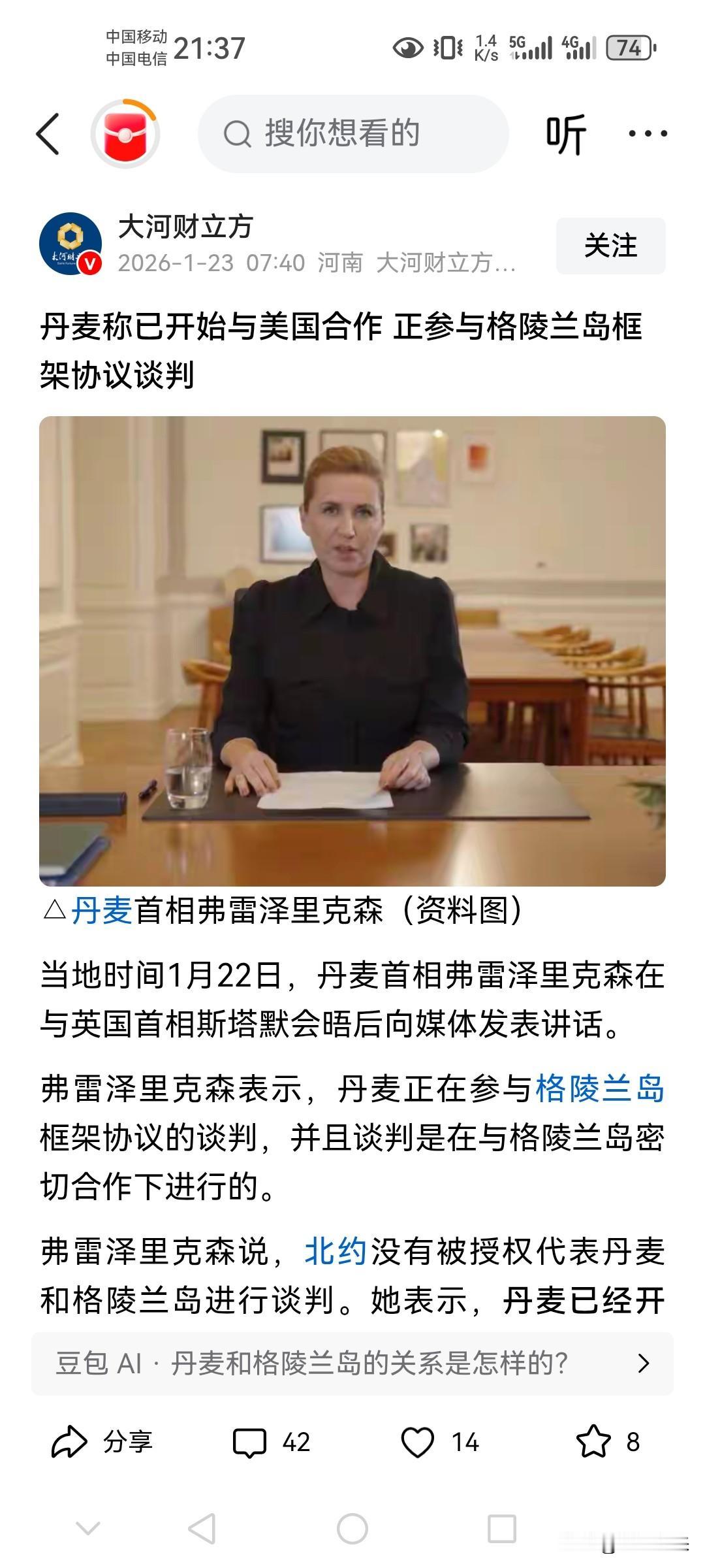 丹麦最终就格陵兰岛问题妥协了! 不妥协只会让问题更加一发不可收拾! 既然丹麦打不过、惹不起、躲不起美国,那就一起合作吧… 丹麦首相弗雷泽里克深称:已开始与美国合作,正参与格陵兰岛框架协议谈判! 但是合作归合作,原则和主权问题不容讨论,这就是所谓的红线! 美国也乐此不疲,美国称:谈判开展的很顺利! 毕竟美国也不能武力夺取格陵兰岛,丹麦和美国都是北约成员国,按照北约的规定,一国遭受攻击等同于向北约宣战!美国也不至于糊涂到如此地步!武力只是威慑,给谈判增加砝码! 这就是乌克兰极力想加入北约目的!美国占格陵兰岛 格陵兰岛现状 格陵兰岛危机 格陵兰地缘战略 格陵兰地位 格陵兰岛问题