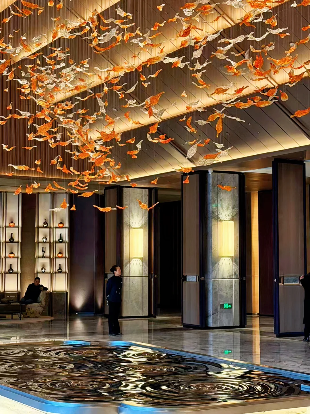 酒店中式园林风贯穿全场,水系绿化让每一步都像在逛江南庭院。华邑酒店以“萧史弄玉”神话为灵感,连廊迂回、庭院雅致,地面投射的凤凰光影与背景墙花纹呼应,细节里全是“凤台栖云”的意境。📸