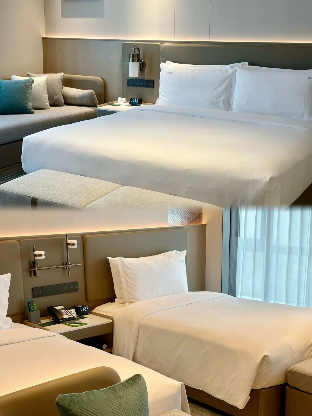 酒店坐落在双照湖旁、奥体中心隔壁,地理位置得天独厚。距西安咸阳国际机场仅11km,咸阳北站2km,下飞机/高铁打车很快就能到,去市区逛街也只需15分钟左右。周边环绕凤凰台、清渭楼、咸阳博物院等人文景点,去袁家村、兵马俑也很方便,逛累了回酒店就能躺平,主打一个省心。