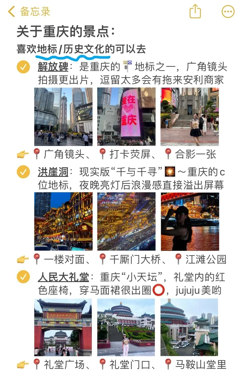 ✔️地标/历史文化:解放碑、洪崖洞、人民大礼堂、李子坝、观音桥、三峡博物馆