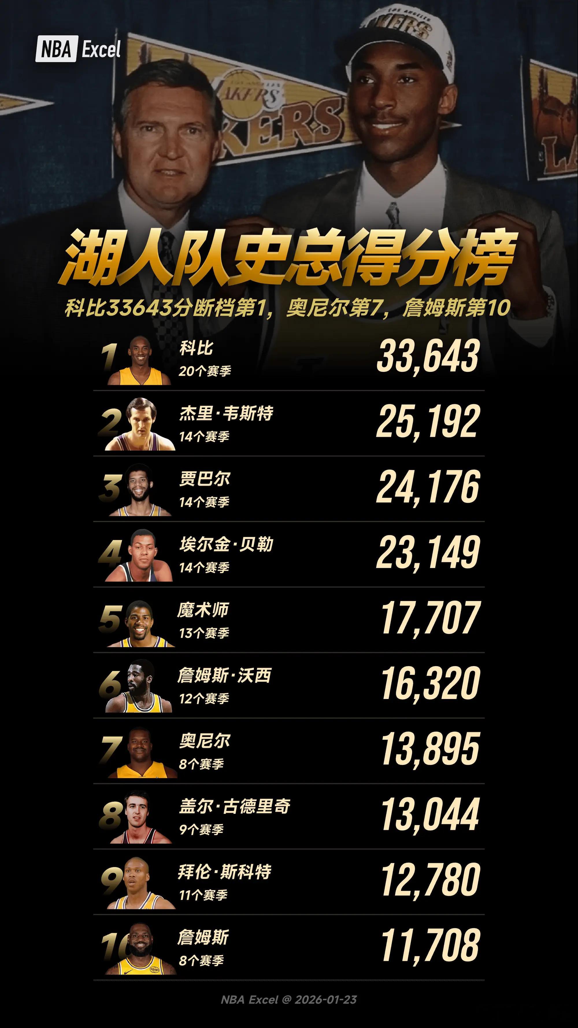 湖人队史总得分榜:科比断档第1,詹姆斯第10