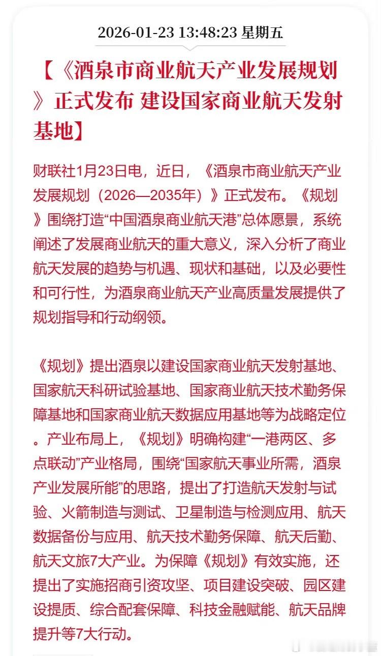 《酒泉市商业航天产业发展规划》正式发布 建设国家商业航天发射基地。