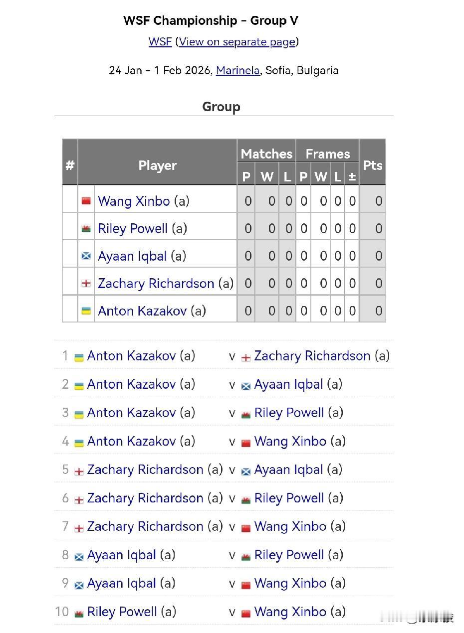 WSF锦标赛今天开打,2月1日决出冠军,冠军将获得职业资格。白朗宁、邢子豪参赛。