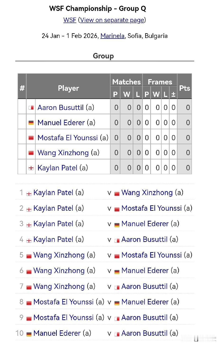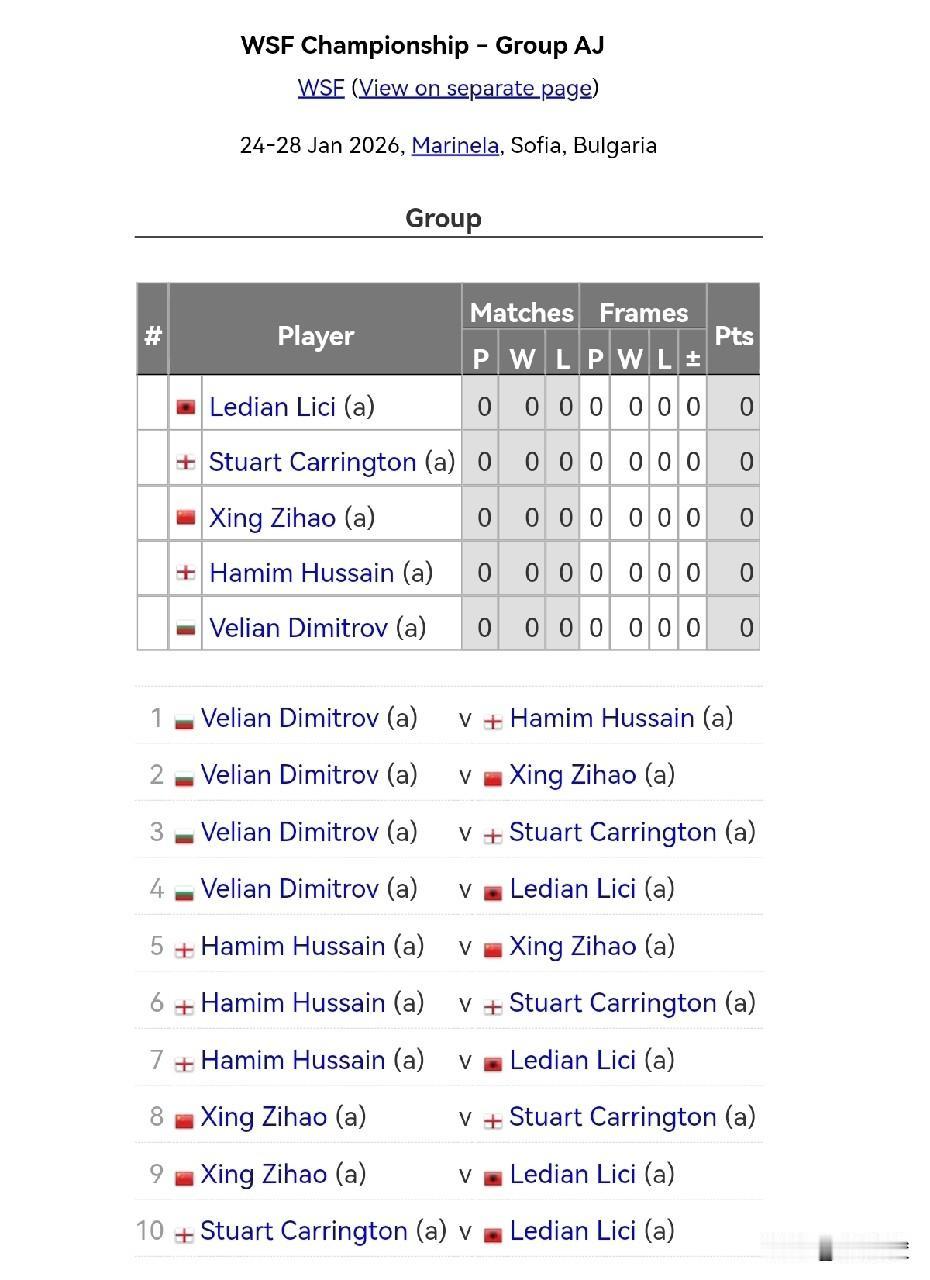WSF锦标赛今天开打,2月1日决出冠军,冠军将获得职业资格。白朗宁、邢子豪参赛。 与刚刚结束的WSF青少年锦标赛不同,WSF锦标赛没有年龄限制,因此参赛规模扩大。中国球员中,之前参加青少年锦标赛的球员也参加此项赛事。 细数了一下,今年的WSF锦标赛人数达到193人,共分为39个组,每组5人(有两个组4人),小组前两名晋级下一阶段。 中国一共有12名球员参赛。其中包括王信仲、王信仲兄弟俩和王宇航、陈启恩,另外还有邢子豪、白朗宁、徐嘉瑞,以及廖予生、冯国威、郑宇乔等一些中国香港球员。 值得一提的是,邢子豪曾经是职业球员,两个赛季后降级,白朗宁也打过职业,后被禁赛,这是他解禁复出后首次参赛。 接近200人参加的比赛,争夺一个职业名额,激烈程度可想而知。之前张家玮、高阳就是通过这项赛事获得职业资格的。 中国球员加油!