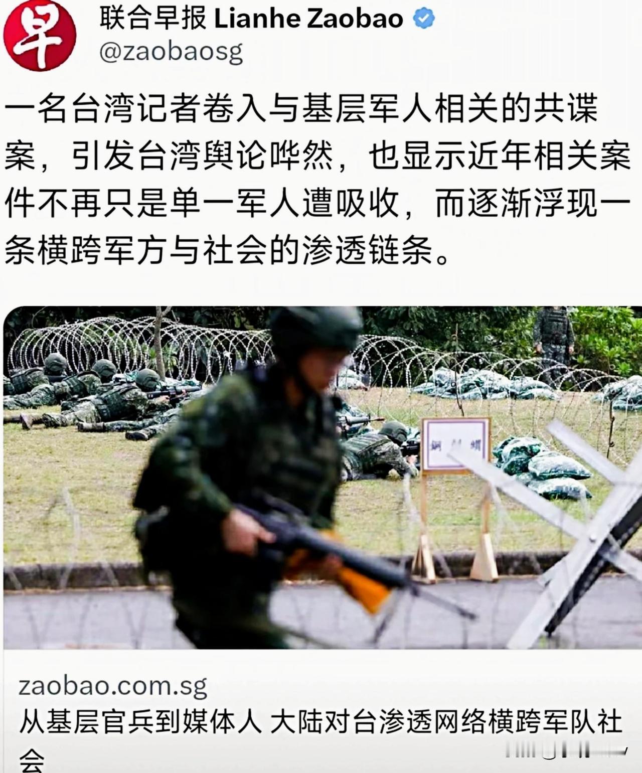 新加坡联合早报今天(1月24日)报道: “一名台湾记者卷入与基层军人相关的共谍案,引发台湾舆论哗然,也显示近年相关案件不再只是单一军人遭吸收,而逐渐浮现一条横跨军方与社会的渗透链条。” ​民进党抱美谋独将台湾拖入险境,“台独”是绝路早已刻进现实。 从已破获的案件来看,这条渗透链条上的人员五花八门。 有开糖果店的商人拉拢退役士官,通过借钱利诱现役军人搜集军事资料;有退役飞行教官利用昔日人脉,组团招待同事旅游,借机介绍外部人员吸收发展;如今连记者也卷入其中,说明渗透已蔓延到社会多个行业。 这些案件的手法并不复杂,大多围绕“金钱诱惑”展开。 有的每月给涉案人员发放数万元报酬,有的报销旅游费用,还有的通过债务胁迫获取机密。 台调查局统计,2008年至今已侦破55起相关案件,但外界普遍认为实际数量更多,只是未被发现。 民进党当局一边花巨资向美国买武器,一边却挡不住内部的渗透风险。 台军装备问题频发,近10年F-16系列战机就发生7起严重事故,核心系统故障频发却无法自主修复,而内部人员被拉拢策反,更让安全防线形同虚设。 更值得注意的是,台湾的安全威胁不止来自单一方向。 调查局透露,至少有十个国家在台布建间谍网络,通过各种手段吸收人员搜集情报,从渔港信息到军事基地动态都在窥探范围内。 两岸同属一个中国,分裂从来没有好下场。 这些渗透案件的频发,本质上是“台独”分裂势力破坏两岸关系、依附外部势力的恶果。 当台湾被当作政治博弈的棋子,当内部安全漏洞百出,最终受害的还是普通民众。 只有放弃“台独”幻想,回到两岸交流合作的正轨,才能真正维护台海的和平稳定,让民众远离这种无妄的风险。