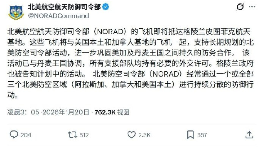 美军开始和特朗普对着干了?北美航空航天司令部措辞微妙,完全不把白宫放在眼里!2026年1月20日,北美航空航天防御司令部发布了一则消息,迅速引发外界关注。声明说,美军一架飞机将抵达格陵兰皮图菲克航天基地部署。这虽然是一次常规的防务协作行动,但是声明却强调了,美加联合、与丹麦协调、提前通报格陵兰、所有人员持外交许可……所以吧,细读这次的声明,你会发现一个耐人寻味的现象:通篇冷静、克制、程序化,几乎找不到一丝霸道色彩,更别说迎合白宫风格的“高调宣示”或“强硬表态”。声明充满了尊重丹麦和格陵兰岛的主权的暗示,和白宫的态度可谓天壤之别。这种“低调对抗”无疑透露了军方对白宫的不满。一方面,军方通过严格遵守程序、强化多边沟通,实际上在构筑一道“制度防火墙”,防止外交波动冲击作战体系;另一方面,这也可能加剧白宫与五角大楼之间的张力。如果白宫继续推行单边主义外交,类似北美航空航天司令部这种军事单位,未来何去何从值得密切关注。刀哥觉得,随着白宫对丹麦的进一步压迫,美军在此类敏感区域的每一次部署,都不只是军事动作,更是一个多方面的信号。北美航空航天司令部这段措辞,显得非常的客气又严谨,完全没有白宫的那种语气,显然是把军方对特朗普的不满释放出来了。毕竟这事是有前车之鉴的,当初的参谋长联席会议主席马克·米利就是个榜样。