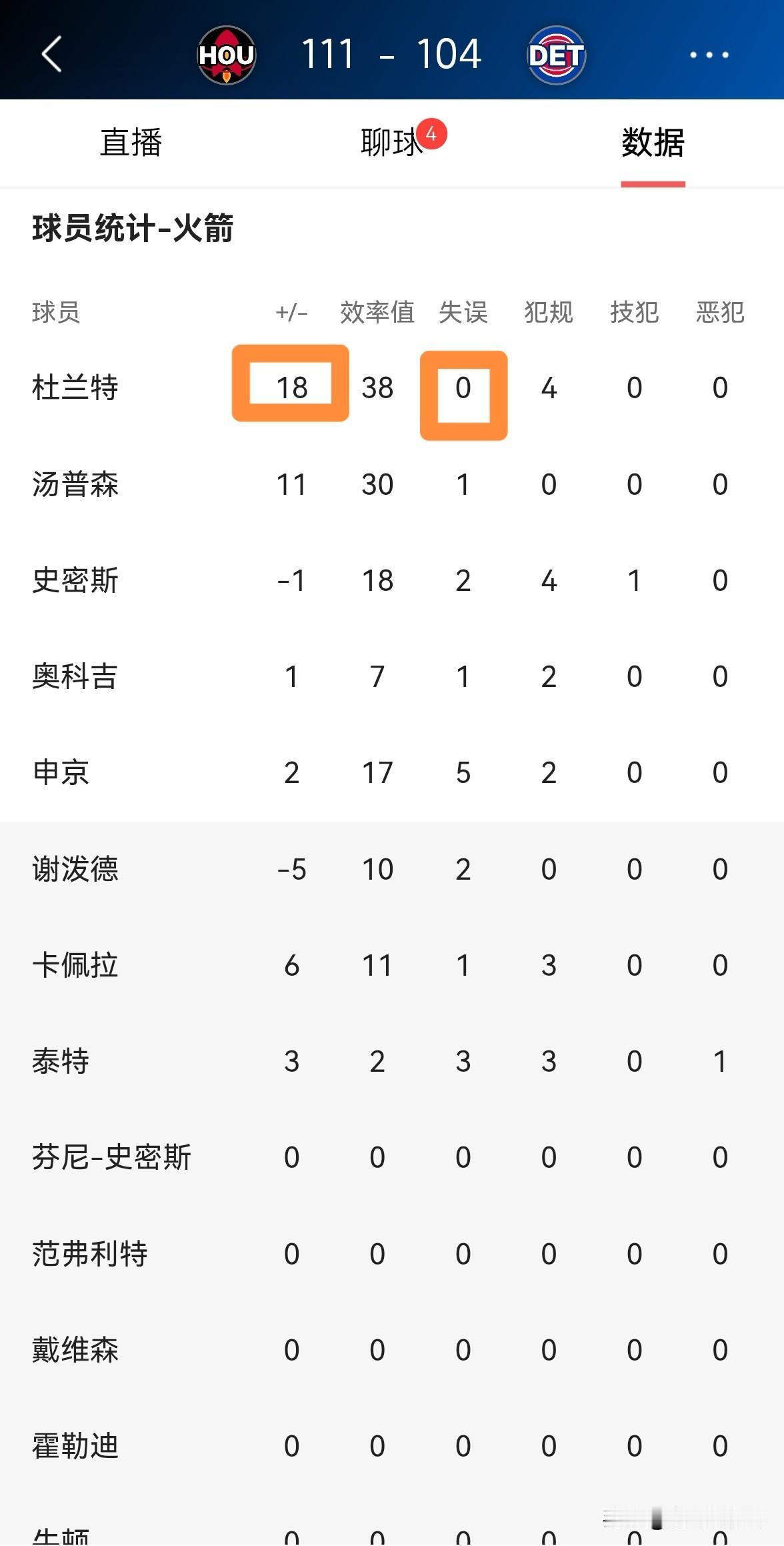 火箭超级球星杜兰特打出了堪称完美的表现!在今天火箭客场以111:104击败活塞的比赛中,杜兰特在攻防两端都打出了接近完美的表现。 全场比赛下来,杜兰特首发出战40分钟,投篮19中11,其中三分球11中5、罚球6中5非常高效的砍下32分,还有7篮板3助攻1抢断1盖帽,没有出现任何的失误,他的场上正负值为全队最高的+18。 事实再次证明,尽管杜兰特已经37岁了,但是他依然是当今联盟最稳定高效的得分手之一。
