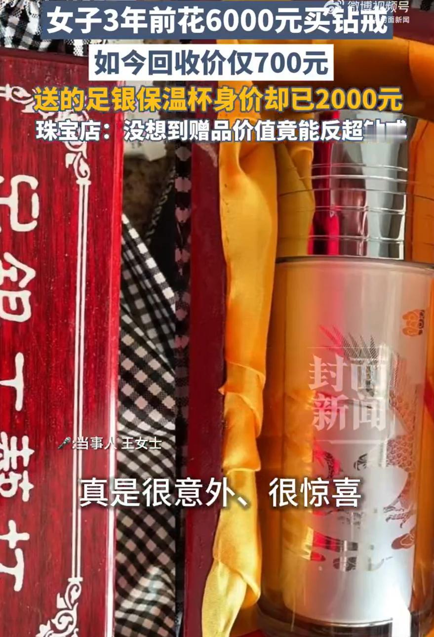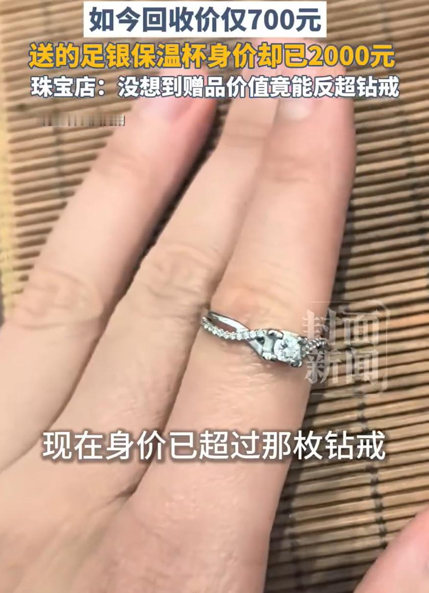 太扎心了!四川简阳,女子看到这段时间银价上涨,突然想起家里有个当初买钻戒时商家送的足银保温杯,一直没拆封。她拿去店里一问,回收价竟然能到两千块,按理说是件高兴事,可王女士却笑不出来,因为当年花六千多买的钻戒,如今回收只能卖七百块左右 王女士说,两年前她在珠宝店选钻戒,正赶上店里做活动,消费满额就送一个足银保温杯。她花六千二百元买了枚钻戒,杯子算是白得的。拿回家后,杯子一直收在储物间里,包装都没打开过。要不是最近总看到银价上涨的消息,她都快忘了还有这么个赠品 她翻出杯子去店称了重,杯身总共380克,去掉盖子、滤网这些不是银的部分,里头纯银内胆大概七八十克。上面还标着足银999,按现在一克二十来块的回收价算,确实能值小两千,而当初也就是价值二三百块 可转头再看看那枚钻戒,问了几家回收店,都说克拉数不大、牌子也不算硬,现在回收行情就七百块上下。王女士心里不是滋味:当年冲着“保值”去的钻戒,几年过去反而跌了这么多,而当时没花钱、随手拿的赠品,倒成了现在值钱的物件 这事听着挺有戏剧性,也让人忍不住琢磨。其实很多人家里可能都有类似经历:当时花大价钱买的东西,过几年可能就不怎么值钱了;反而一些没太在意的小物件、赠品,因为材质实在或是时机对了,悄悄涨了身价 钻戒这类珠宝,本身品牌溢价高,日常佩戴的意义远大于投资保值。除了少数稀缺大克拉、高成色的,普通钻戒在二手市场上确实难卖出价,大家买新的往往更看重品牌和设计,回收时却主要看材质和重量 而像银这样的金属,价格跟着国际行情走,这几年工业需求、投资风向都在变,涨起来也比较直观。保温杯本身有使用价值,银内胆又有材料价值,遇上行情好,自然就显出了优势 这也提醒我们,消费时心态不妨放轻松些:喜欢、需要、有意义,就值得买;若是总想着以后能保值甚至升值,那很可能要失望。生活中的价值,很多时候不在转手的价格,而在当时的心意与陪伴。当然,要是家里也有类似被遗忘的“潜力股”,偶尔整理整理,说不定会有意外收获呢