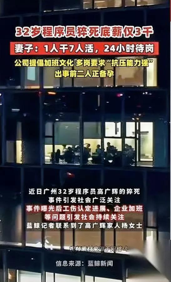 32岁程序员猝死引热议 工作群消息成最后牵挂 周六抢救时,高广辉还在收工作群消息。这位视源股份软件二部经理,一人干着六七个人的活,除了研发,还要陪销售、对接项目。所谓“高薪”竟是低底薪高绩效,底薪才3000多。可公司前三季度营收180亿,却让员工拼到这份上。 加班文化不该是“用命换钱”的借口,当工作侵蚀到健康底线,所谓发展又有何意义?企业赚得盆满钵满时,更该想想怎么善待员工。 这样的加班文化,真的该改改了?你怎么看?