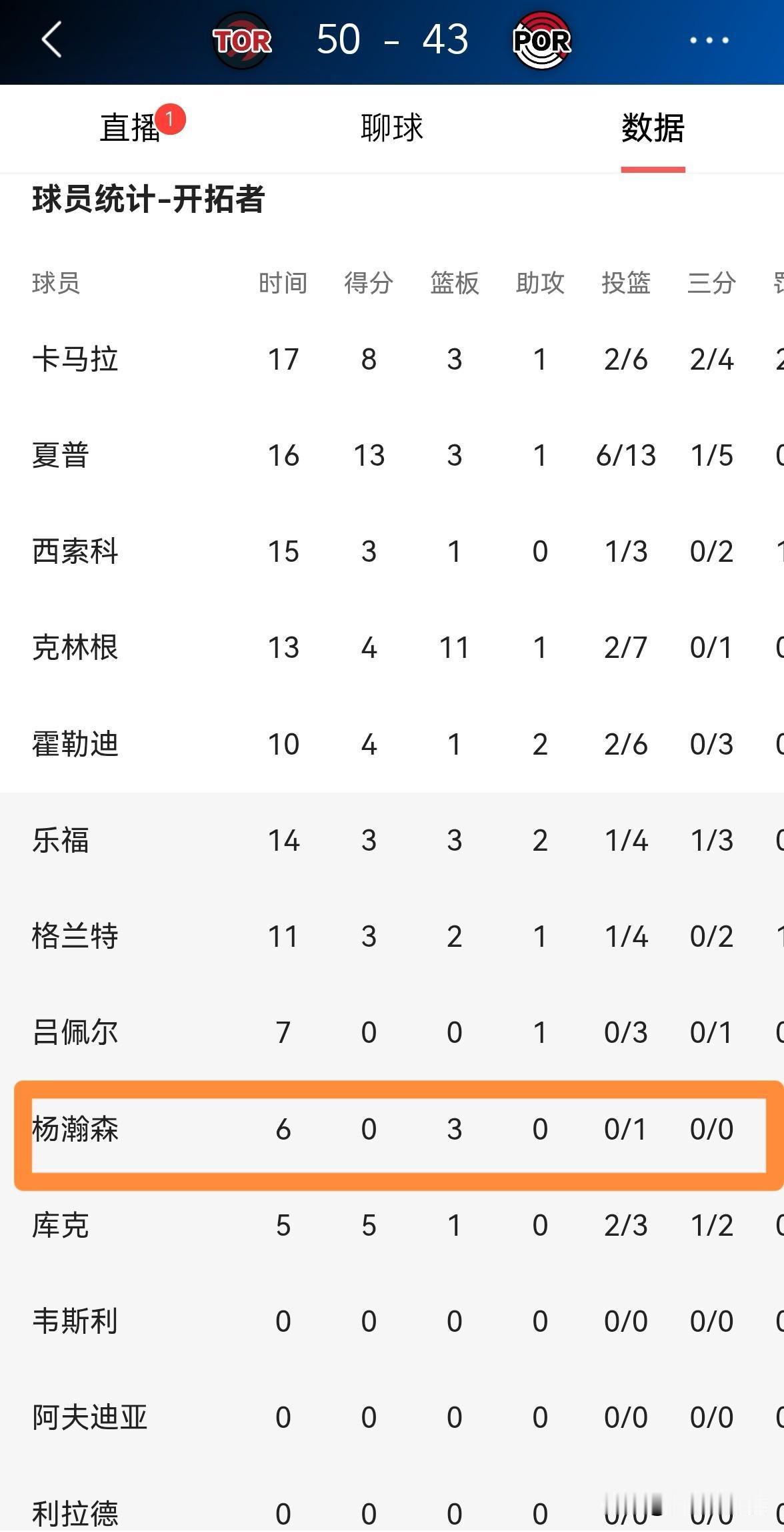 开拓者新秀杨瀚森真是给机会不中用!在今天开拓者主场迎战猛龙的比赛中,目前双方半场战罢,开拓者以43:50落后对手7分,在前两节比赛中,杨瀚森替补出战6分钟,投篮1中0怒砍0分,出现了1次失误,他的场上正负值为全队最低的-11。 平心而论,我们真的不能再责怪开拓者主帅斯普利特了,因为当斯普利特教练给杨瀚森机会时,杨瀚森总是把握不住。
