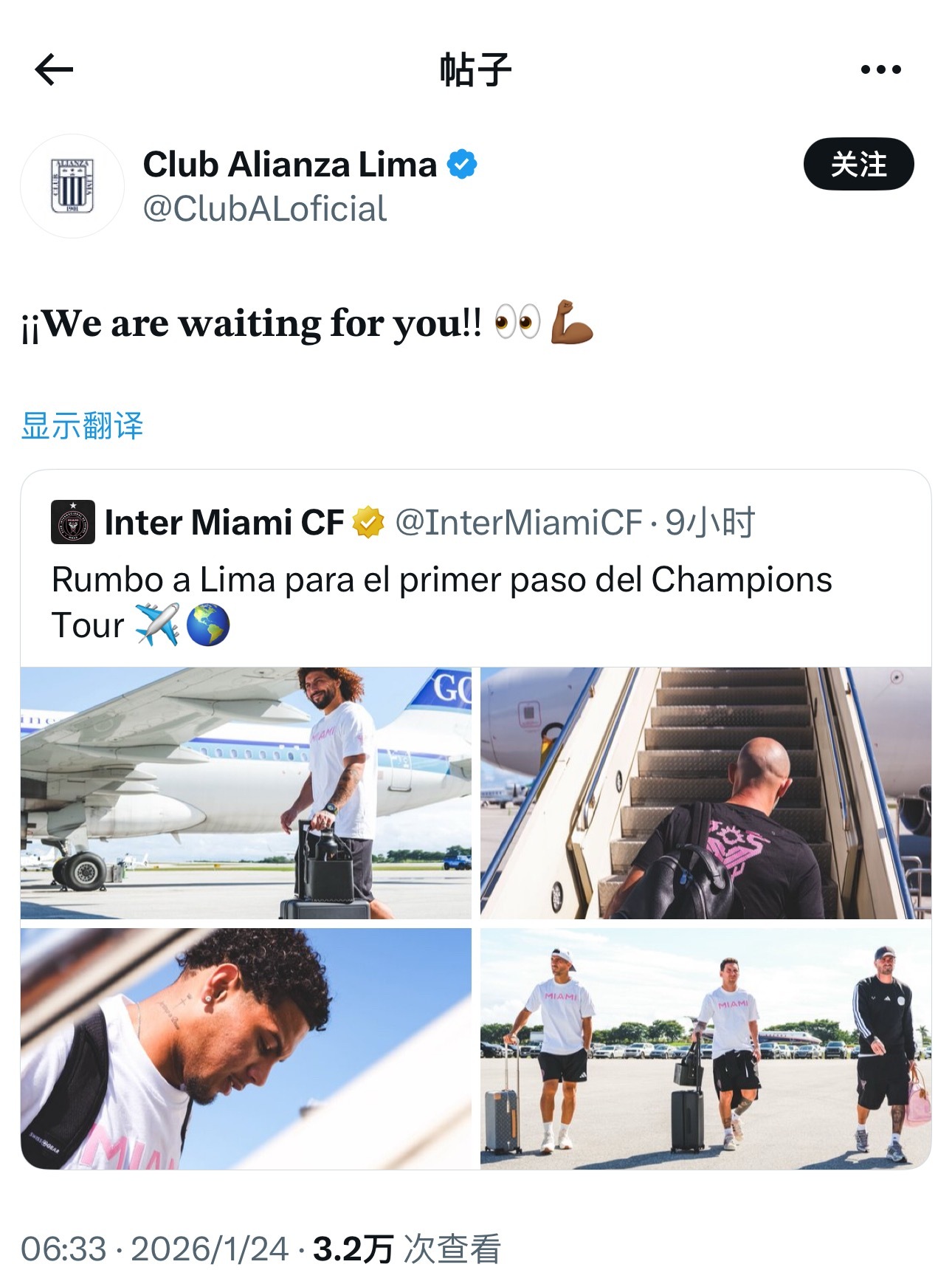 梅西 梅西领衔迈阿密国际,抵达秘鲁,受到热情欢迎👏对手俱乐部也早早表示了期待!季前赛一切顺利喔!🐐利马联盟vs迈阿密国际