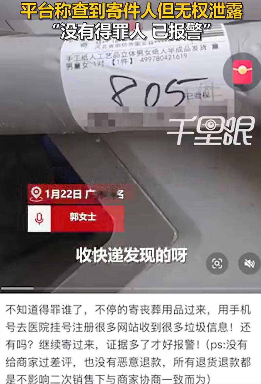 这是多大仇?广东茂名,一男子连续收到两单快递,可自己明明没有网购,快递哪来的,而拆开一看,里面竟然都是丧葬用品,妻子表示:不知道谁寄的,也回忆不起来和谁结过仇! 郭女士说,两个包裹是前两天陆续送到的。查了物流信息,是有人在电商平台下单后,商家直接发货寄来的。包裹里装的是祭祀用品,除了纸衣服,还有那种童男童女的纸扎人。这事搁谁身上都觉得晦气 平台那边倒是查到了下单人的信息,但以保护隐私为由,不肯透露给郭女士,只建议她报警处理。目前郭女士已经报了警,正在等警方的调查结果 有网友说:收到一次可能是恶作剧,连续两天就是故意的 细想一下这说的确实有道理,收到一次这样的快递,可能真的只是一个人心血来潮的恶作剧,或者是弄错了信息,但连续两天收到了类似的包裹,那就很难说是“无心之失”了,更多的可能是有人在故意制造麻烦 很多人收到快递,一看不是自己买的,可能随手就扔了。但郭女士还是拆开了,这一拆,就拆出件烦心事。如今报警了,但这类事情查起来也不容易。下单用的可能是别人的账号,地址电话也未必是真的。就算最后找到了人,如果对方咬定是寄错了,或者开玩笑过了头,处理起来也挺麻烦 我们生活中,难免会和人发生点摩擦。但正常情况下,吵两句、生个气也就过去了。能恨到用这种方式出气的,这得是多大的过节? 郭女士说想不起来和谁结过仇,这话有两种可能:要么是真没意识到自己哪里得罪了人,要么就是对方心眼太小,把一件郭女士根本没放心上的事,记成了深仇大恨 如今网上买东西太方便了,知道个地址电话,就能给人寄东西。这种便利,反过来也成了某些人发泄情绪的工具。除了这种寄丧葬用品的,还有给人寄寿衣、寄墓碑模型的,甚至还有故意给人订外卖、订上门服务的。这种行为,游走在法律和道德的边缘,即便够不上严厉的处罚,也足够恶心人一阵子