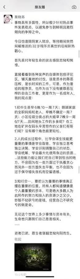 副总发言惊到我了! 把猝死原因全推给员工? 某公司副总对员工猝死"有感":先标榜自己不轻易评论时事,转头就把锅全扣逝者身上,称其"不会取舍、不懂平衡"。按这逻辑,全职宝妈的崩溃、初中生的抑郁、环卫工的艰辛,都成了"不够通透"?可真正该追问的,难道不是24小时on call的变态制度?不是抢救时还被拉进工作群的荒诞?不是超负荷工作下根本不存在的"平衡空间"?副总轻松谈"取舍",是因为他坐在办公室喝咖啡,而普通员工连喘口气都怕耽误工单。嘴上说着"逝者已逝",不如先把赔偿落到实处,把压榨换成尊重——毕竟,职场健康从来不该由打工人用命买单。你觉得,这种"受害者有罪论"该醒醒了吗?