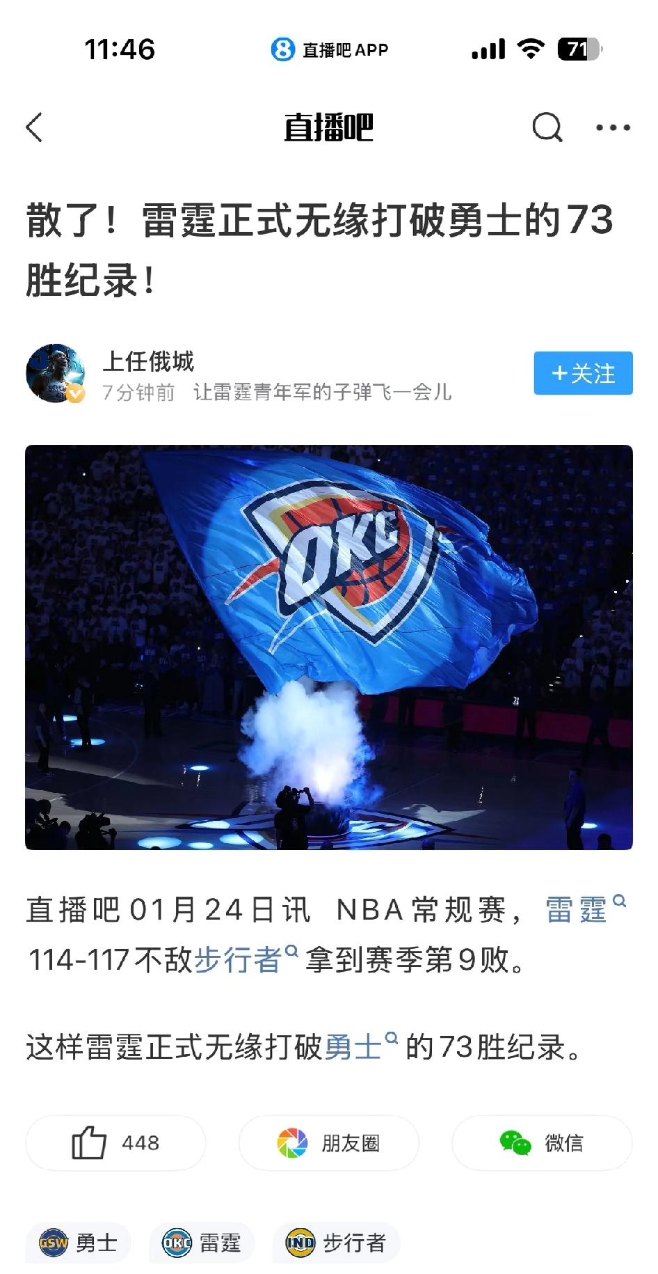 散了!雷霆正式无缘打破勇士的73胜纪录! 01月24日讯 NBA常规赛,雷霆114-117不敌步行者拿到赛季第9败。这样雷霆正式无缘打破勇士的73胜纪录。虽然雷霆真的很强,但是宇宙勇是历史级别的啊,两个MVP,一个历史级别3D,一个一防,还有一个伤前是联盟顶级中锋的表。这样的阵容历史上没有那支球队能匹配上。