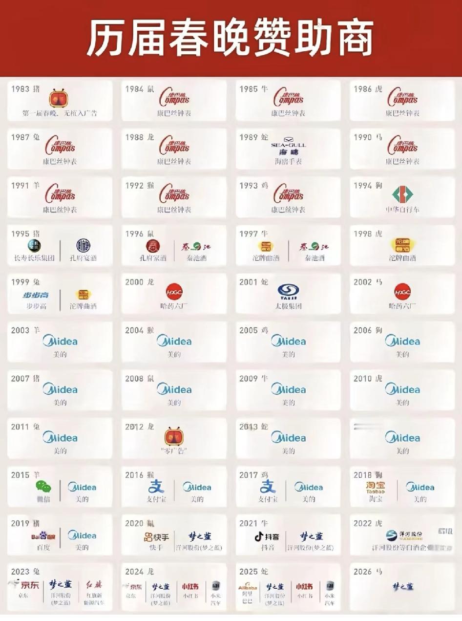 历届春晚赞助商里,康巴丝钟表我真没听过,原来以前这么牛啊!不过美的是真厉害,常年在春晚露脸,算是陪着大家过年的老熟人了~