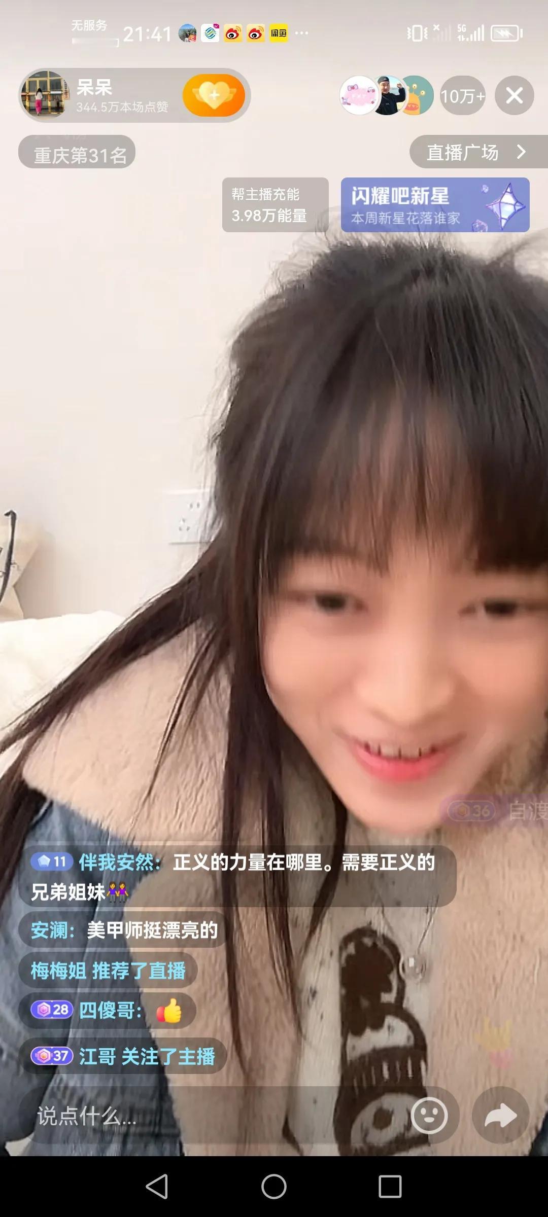 唯有真诚,真实才是第一王道,大道至简,合川呆呆今天晚上直播了,开播一小会就上十万加,她说她91年的,直播时间把打赏功能都关了,偶尔聊两句,看出来真的真实,很有原则性的女生,说实话,面对直播间那么多人,比现场那么多人要好点吧!希望她越来越好,她在直播间说,让大家给她多提意见了及建议。以上仅供参考,属个人意见!