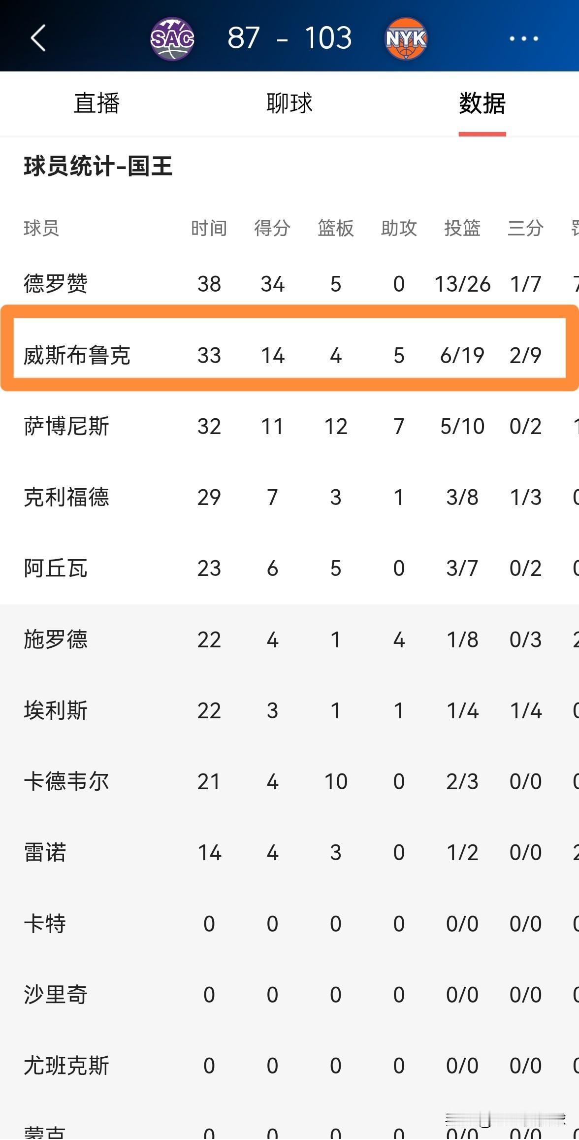 国王球星威斯布鲁克真是太不自量力了!在今天国王客场以87:103输给尼克斯的比赛中,威少在明明手感冰凉的情况下依然疯狂的出手19次,威少的选择属于典型的不自量力。 整场比赛下来,威少首发出战33分钟,投篮19中6,其中三分球9中2非常低效的得到14分,还有6次失误和4次犯规,他的场上正负值为-17。 作为一名控球后卫,威少在比赛中不专注于组织串联,却专注于打铁,国王不输球才怪呢。