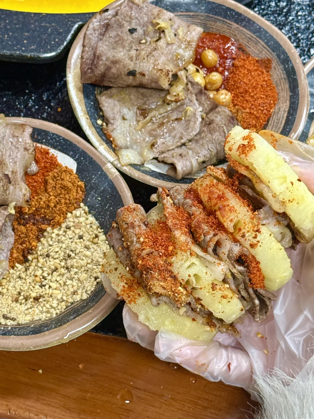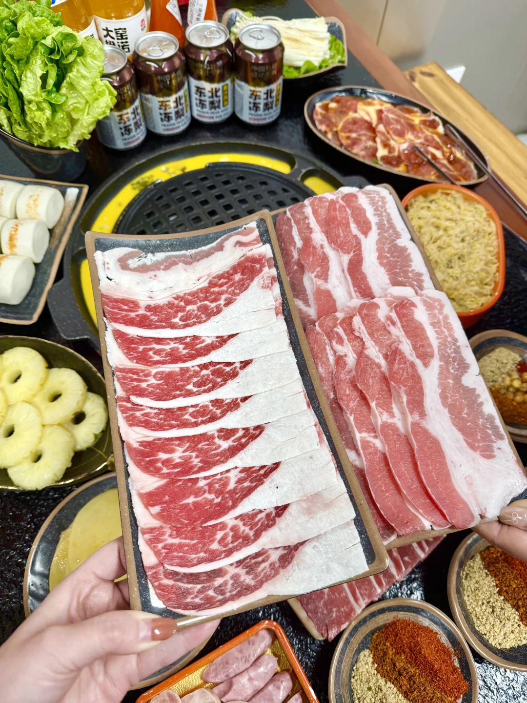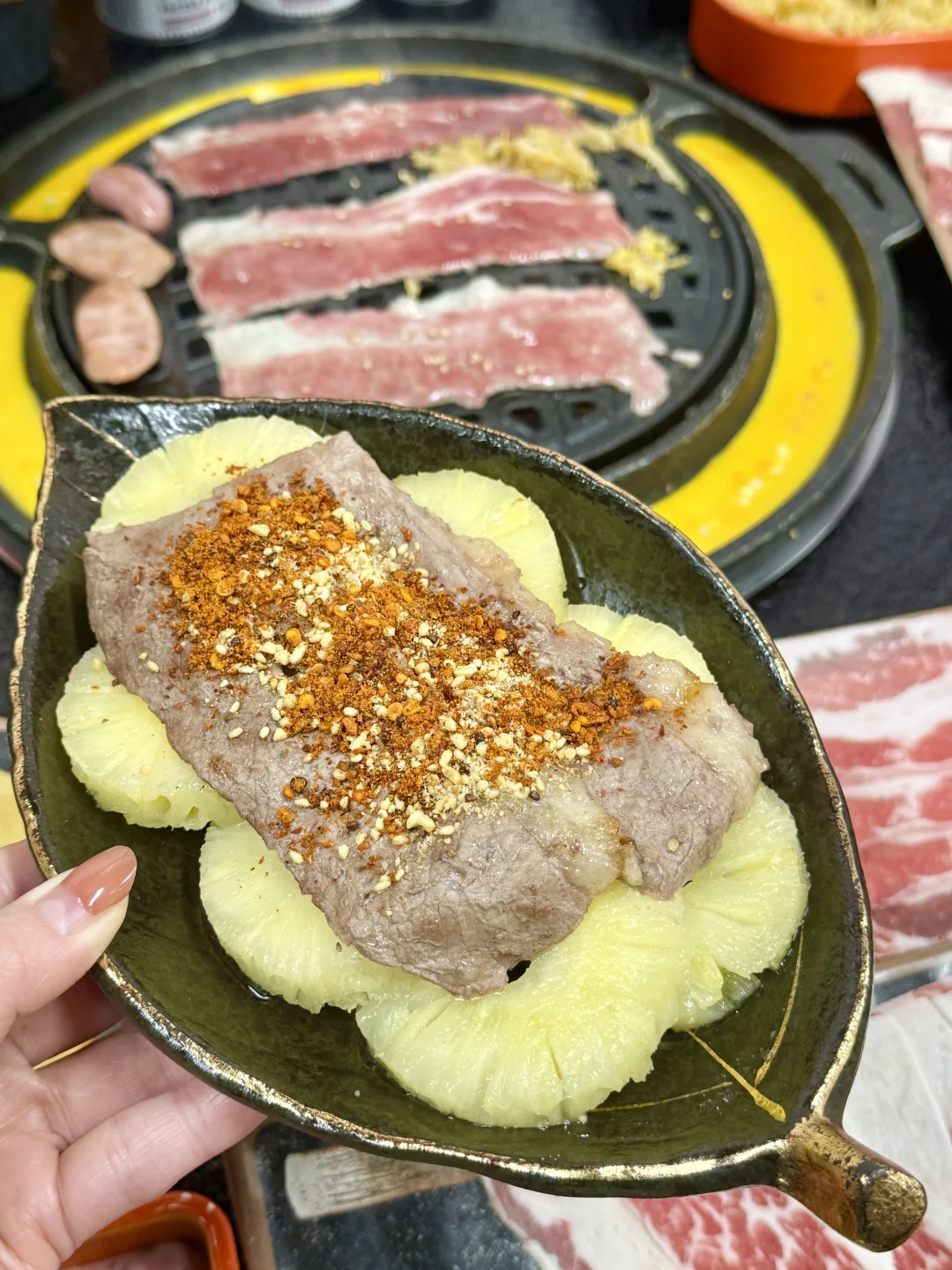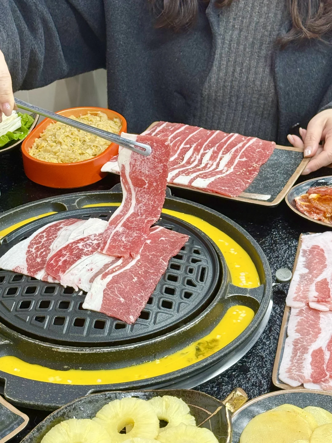 开在居民区里超低调 一到🥩饭点就满座 还🈶互动脱单墙有意思😎 炭火🔥直烤超带劲 🐮肉都是看的到的新鲜 卷着东北🥬酸菜一口封神 肉香混着酸爽简直绝了👍 解锁凤梨🍍烤肉新吃法 凤梨的酸甜配上烤肉的油脂太搭了 谁能懂人均💰几十就能吃到撑! 无锡烤肉推荐