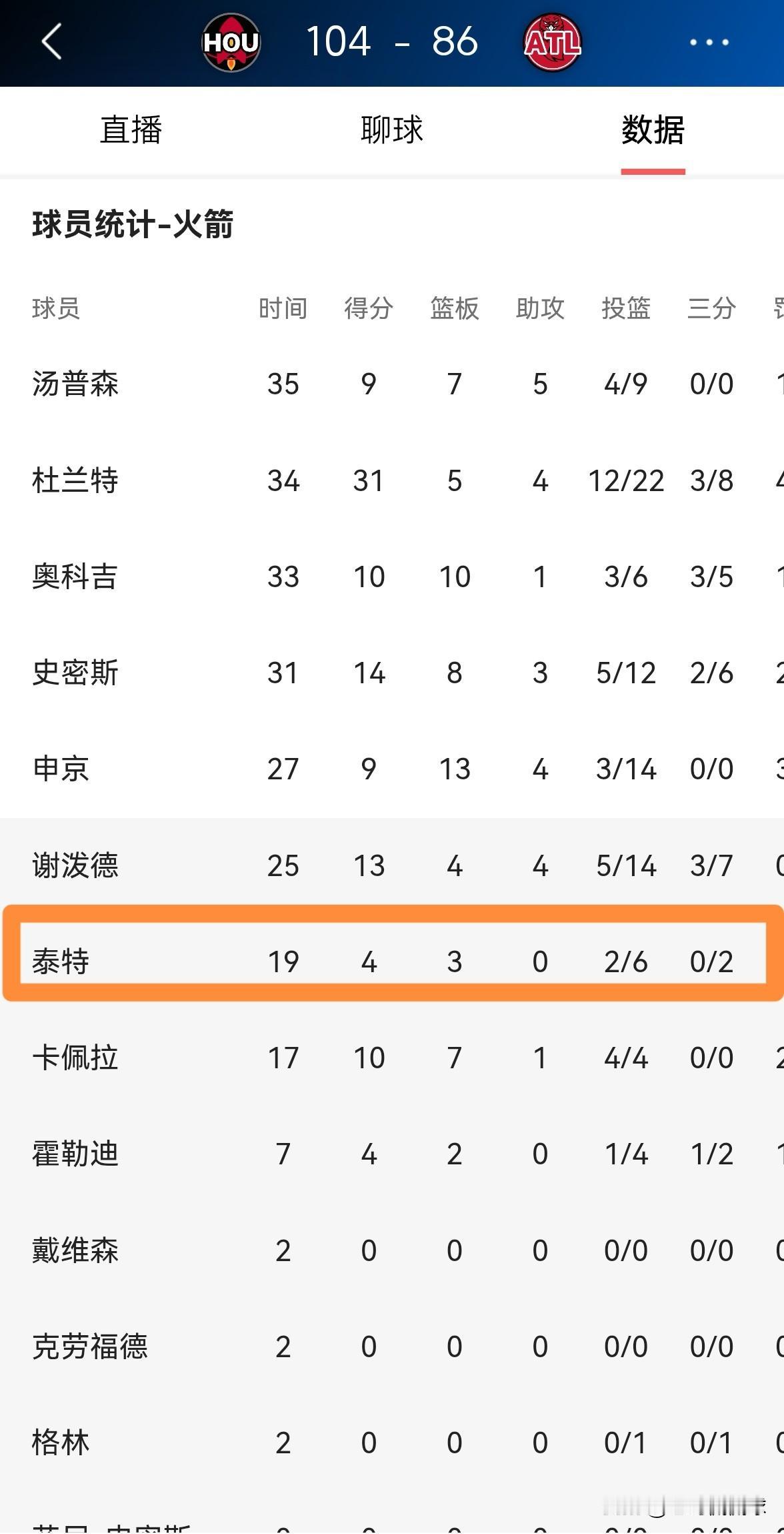 火箭大将泰特又把三分投篮包弄丢了!在今天火箭客场以104:86大胜老鹰的比赛中,泰特又把自己的三分投篮包弄丢了,他在三分线外颗粒无收。 整场比赛下来,泰特他替补出战19分钟,投篮6中2,其中三分球2中0得到4分3篮板1抢断,他的场上正负值为+5。 老实说,如果泰特在比赛中无法命中空位三分,那么他绝对不会得到稳定的上场时间,因为火箭的队内竞争真是太激烈了。