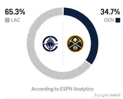 ESPN真是太看得起快船了!明天快船将会在客场挑战苦主掘金,今天ESPN对于这场焦点战进行了一番预测,结果显示快船赢球的概率为65.3%,而主场作战的掘金仅有34.7%的获胜概率。 虽然明天掘金是背靠背作战,而且球队两大主力约基奇和戈登都会因伤缺阵,但是我仍然不相信快船能够在客场击败掘金,因为快船双星哈登和伦纳德在掘金的主场总是会拉胯。
