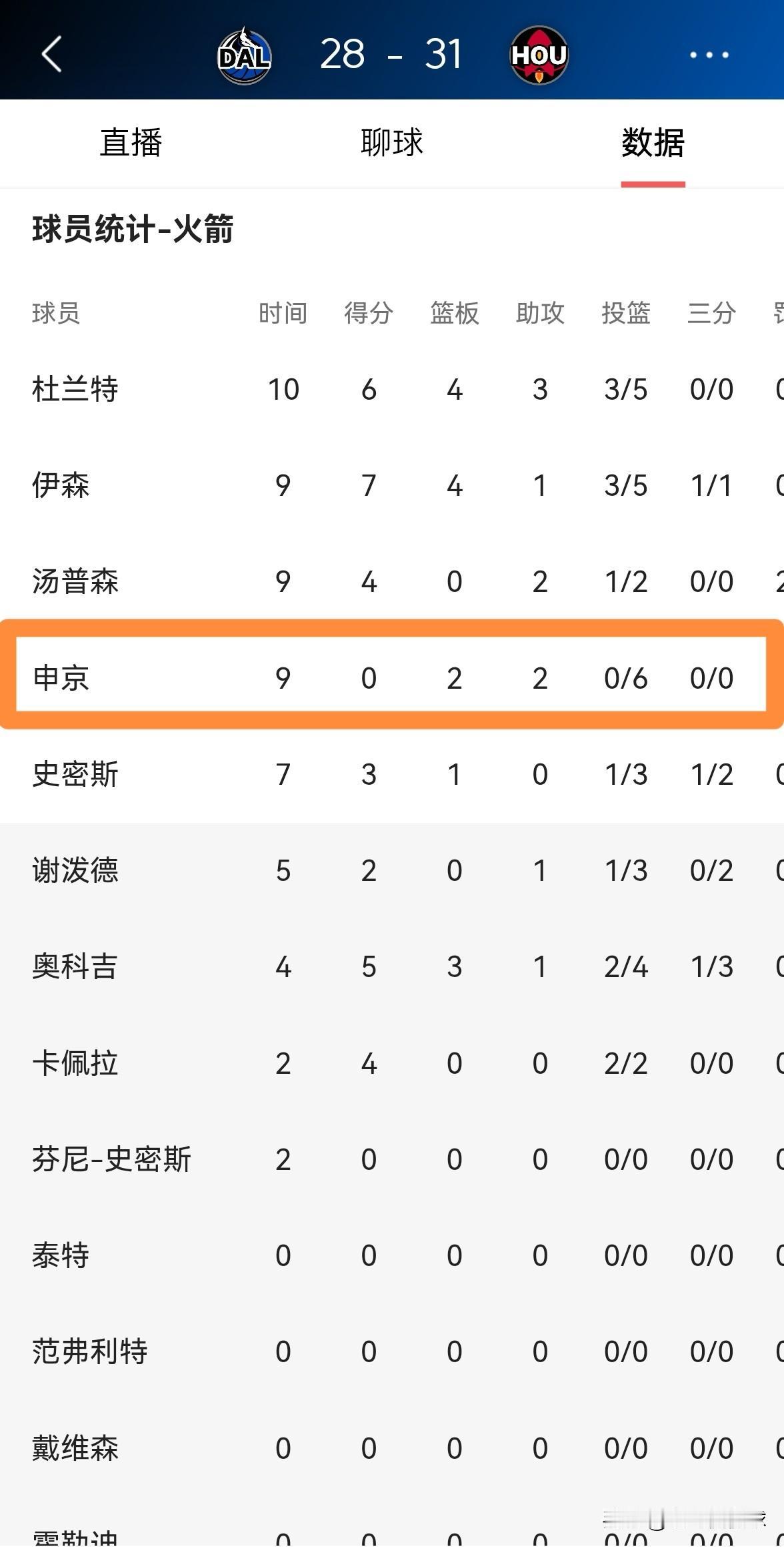 火箭超级中锋申京真是无药可救了!在今天火箭主场迎战独行侠的比赛中,目前双方的第一节比赛已经结束,火箭暂时以31:28领先对手3分。让人感到无比失望的是,在首节比赛中,申京首发出战9分钟,投篮6中0怒砍0分,还有1次犯规。 作为当今联盟排名前五的中锋,申京的表现竟然如此的糟糕透顶,真是让人忍无可忍,申京真是没救了。