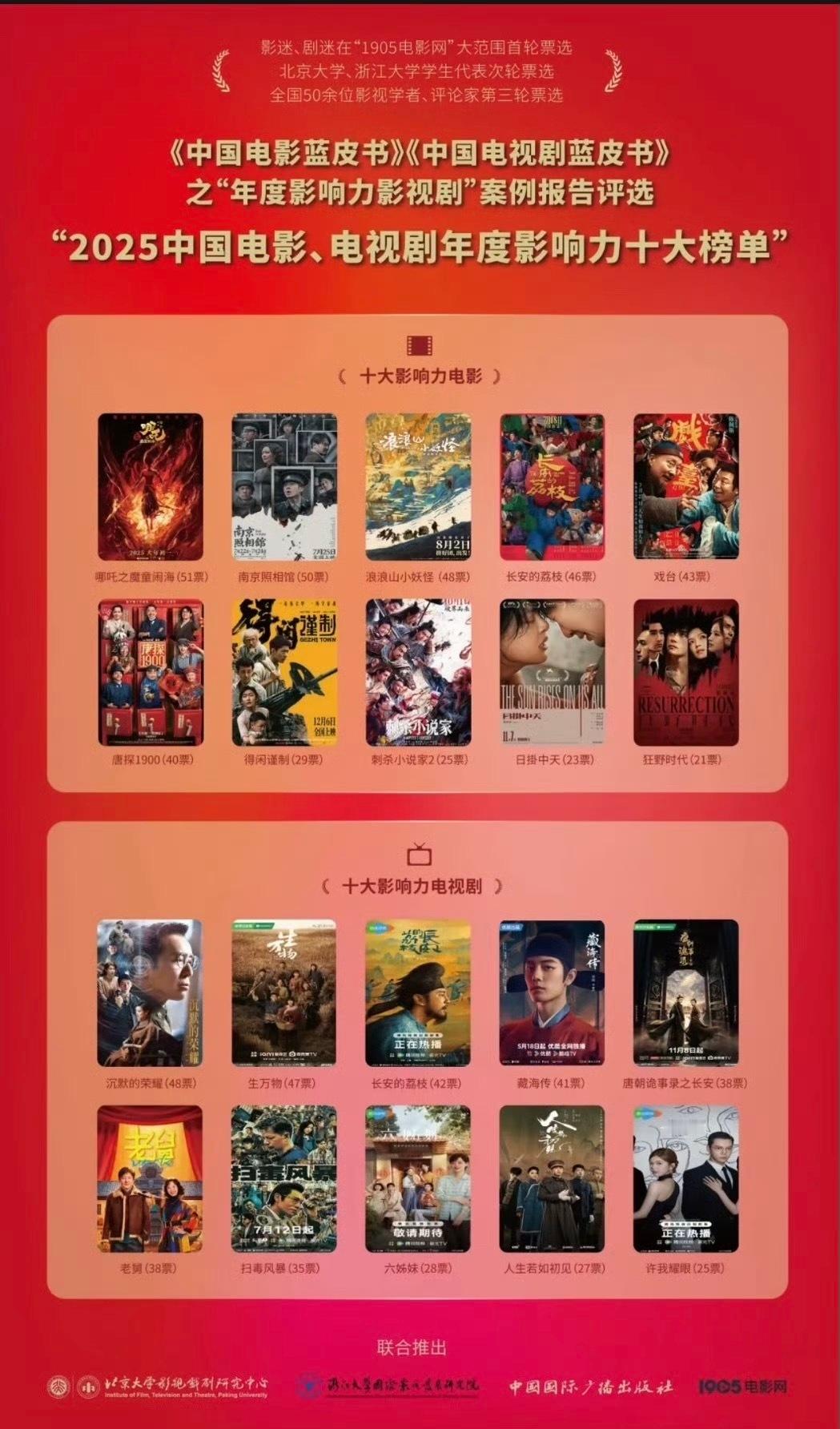 2025中国电影蓝皮书十大电影哪吒之魔童闹海、南京照相馆、浪浪山小妖怪、长安的荔枝、戏台、得闲谨制、刺杀小说家2、日挂中天、 狂野时代。2025中国电视剧蓝皮书十大电视剧平凡的荣耀、生万物、长安的荔枝、藏海传、唐朝诡事录、老舅、扫毒风暴、六姊妹、人生若如初见、许我耀眼。