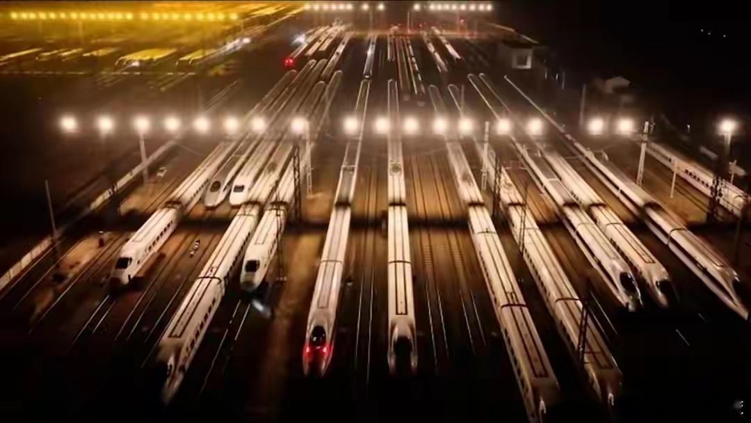 俯瞰陆地航母蓄势待发好壮观 高空看过去也太震撼了!一列列动车整整齐齐列阵在铁轨上,银灰色的车身连成一片,像艘巨型航母静静蛰伏,等着启航的信号。灯光映着铁轨,每一处细节都透着规整的力量,这画面看一次惊艳一次!